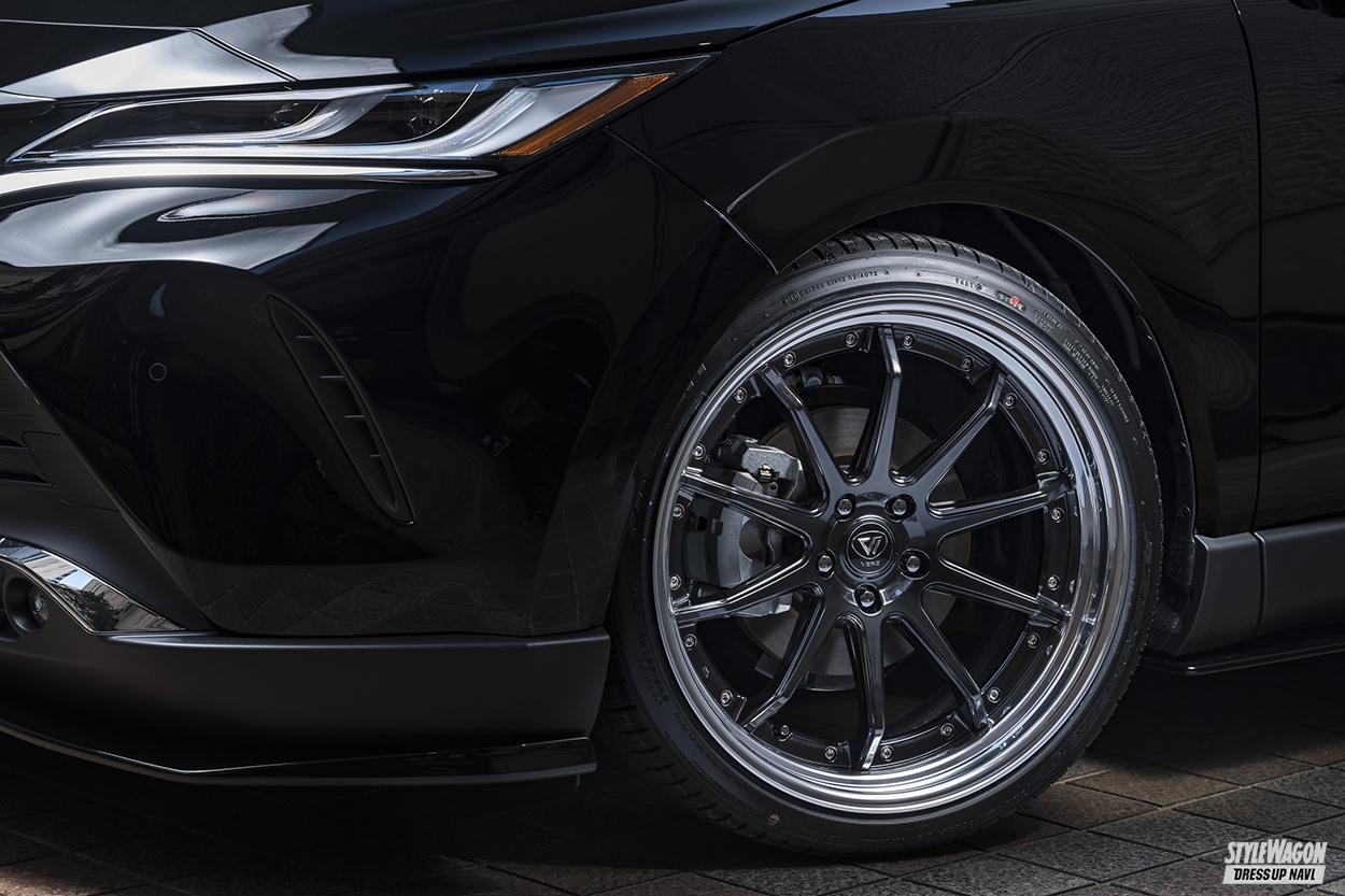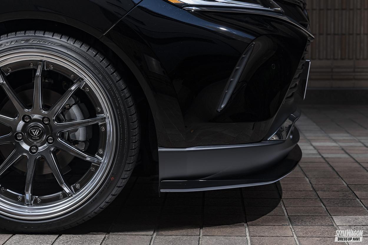 洗練された流麗なハリアーの純正シルエットを生かしつつ、さり気なく個性もプラスしたい。そんな純正リスペクトのホイールプラスアルファな装いにしっくりとハマるのが、大人シンプルなクルーズbyクールレーシングのスタイリング。厚さがわずか10㎜という極薄のフラップ形状でありながら、クールらしい躍動感やスポーツテイストを確実に底上げできるフィニッシュとなっているのがその魅力だ。