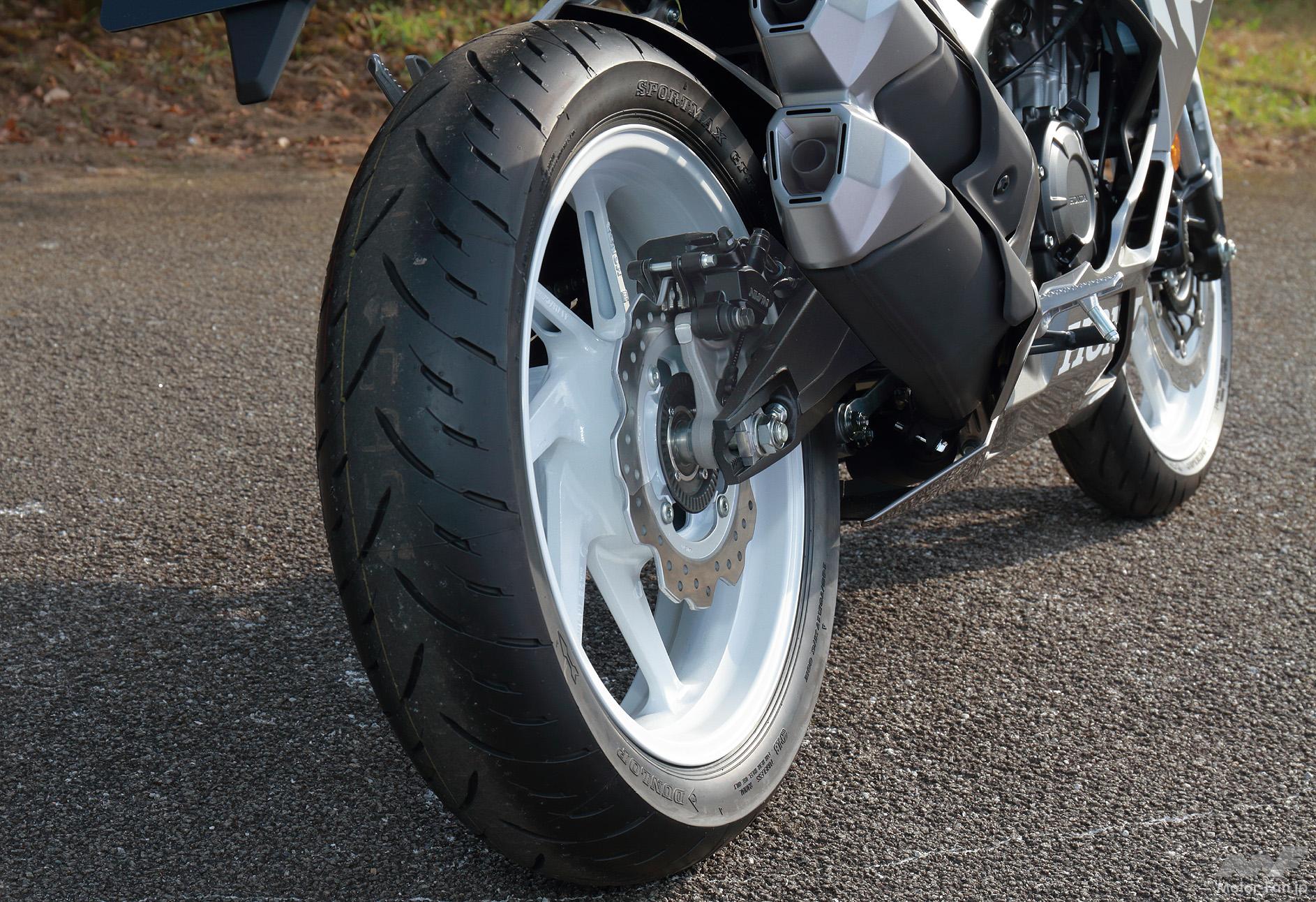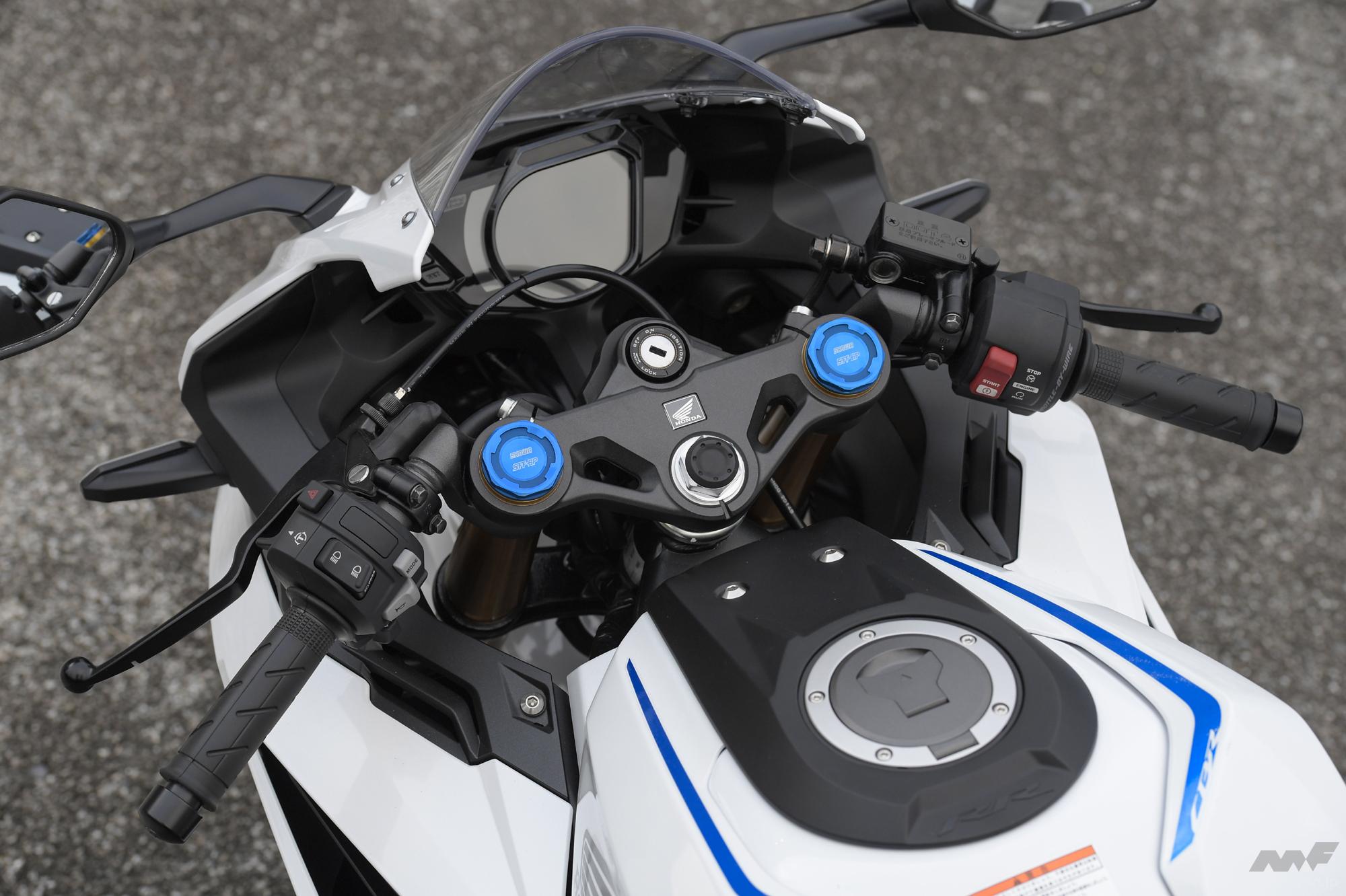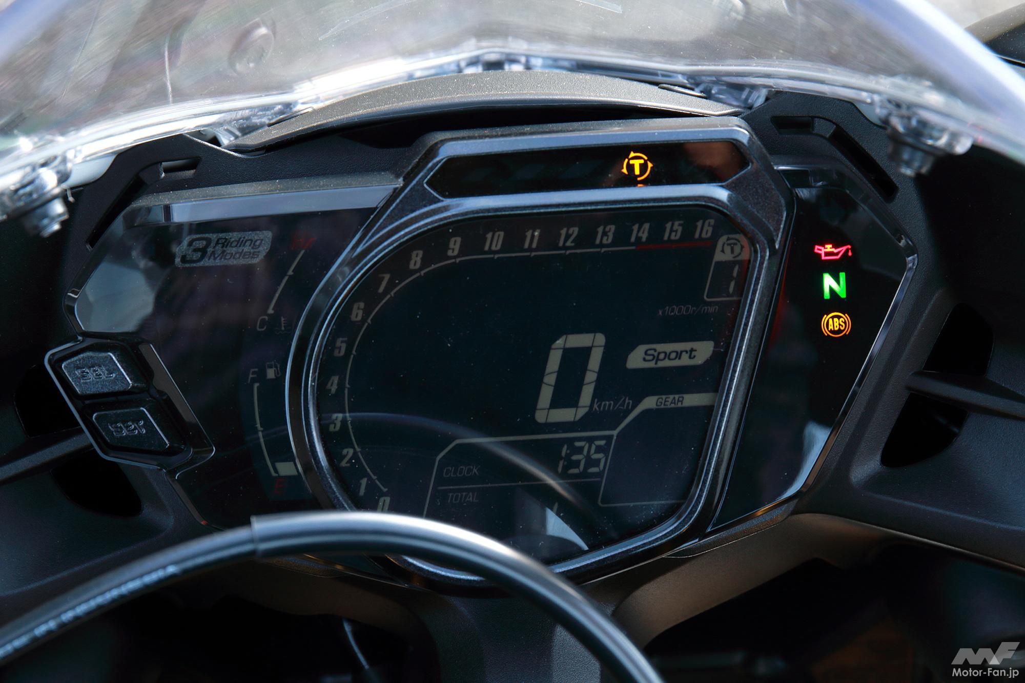 撮影車両に装着されていた前後タイヤはダンロップ製のSPORTMAX GPR-300。これに関しては従来通り。目つきの鋭いLED式ヘッドランプやスピードメーターも共通に見えるただしその液晶表示内容のデザインには、微妙に手が加えられている。シフトタイミングをLEDの点灯と点滅で知らせる5連REVインジケーターも少し変更されたよう。もっともレブカウンターに示されたレッドゾーンは14,000rpmからと変わりない。
