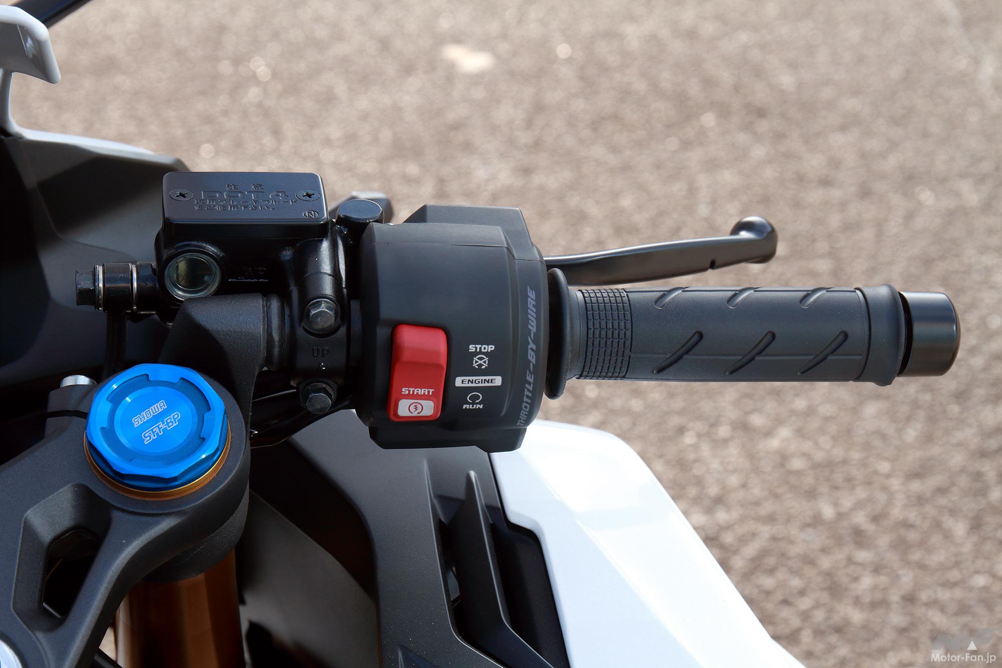 ハンドルスイッチも右側は同じながら、左側は新しくなっており、モード切り換えスイッチが手前に来て、上にはハザードスイッチを新設。人指し指で扱う向こう側のスイッチはトラクションコントロール用になっていた。 その他ブレーキやサスペンションなどにドラスティックな変更は認められないが、フロントにはφ37mmの倒立タイプ。セパレート・ファンクション・フロントフォーク・ビッグピストンの日立アステモ(SHOWA)製が装着されていた。