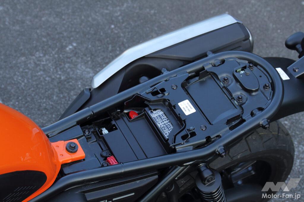 レブルと比較すると、ステップ位置はスイングアームピボットよりも後方に移設されている。