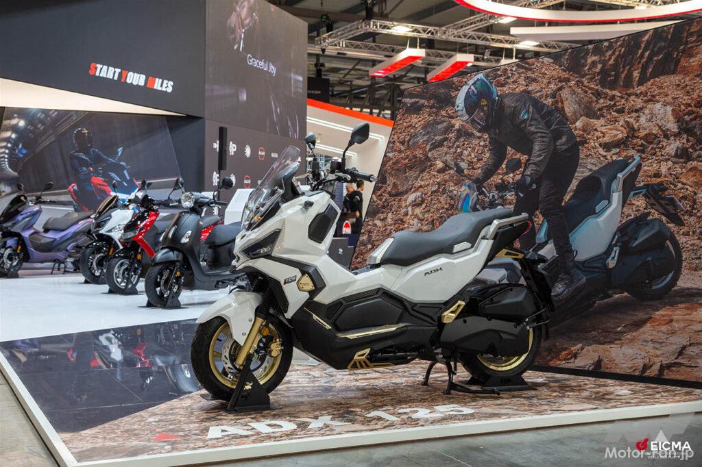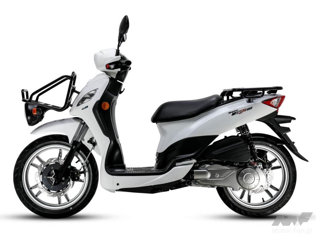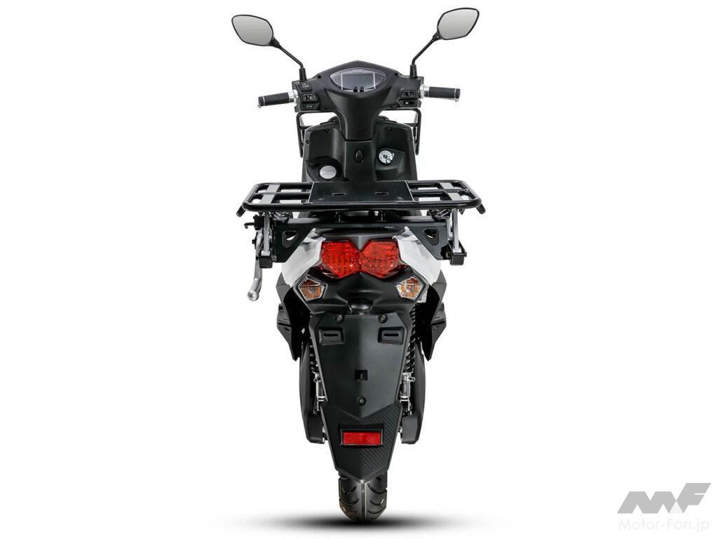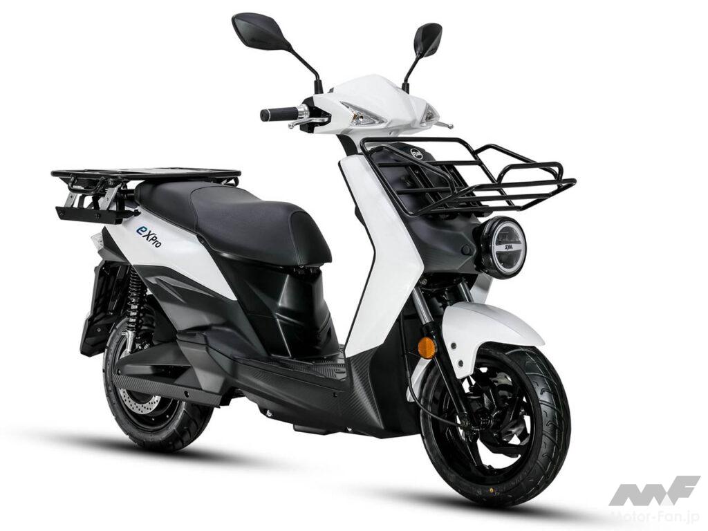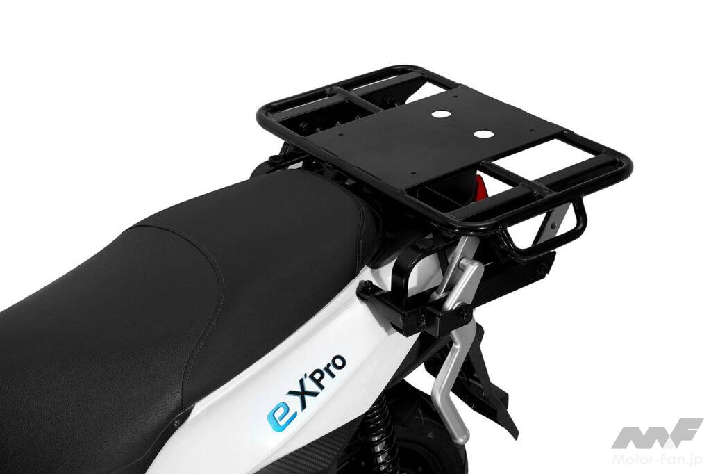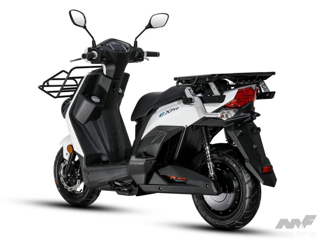 「e X’Pro」はデリバリーや営業などの近距離移動など、ビジネスでの使用を想定した電動スクーター。最高出力2kWのモーターは、35.2Ahのバッテリーによって駆動。航続距離を稼ぐため、着脱可能なバッテリーは2個搭載可能としている。