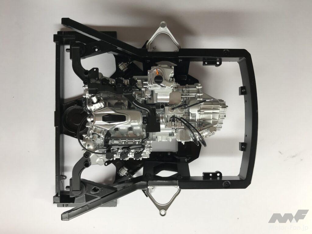 初代NSXは同じV6エンジンですがミッドに横置き搭載でした。しかし新型NSXは縦置きです。横置きはスペース効率的には優れていますが、トランスミッションの配置が厳しくなってしまったり、重量が後ろに偏ってしまったりという弊害があります。そのため本格ミッドシップスポーツはエンジン縦置きというのが定石です。