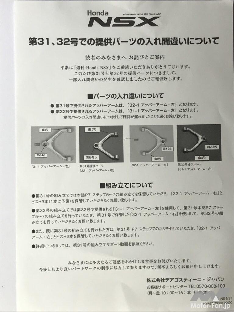 前号、Vol.30にお知らせの手紙が入っていました。それによると、Vol.31とVol.32のパーツが入れ替わってしまったとのこと。いずれもリヤサスペンションのアッパーアームですが、Vol.31では左側の組み立てなのに右側用、Vol.32では右側の組み立てなのに左側用がそれぞれ同封されてしまったとのこと。まぁ、形が似てますからね~。間違えもするでしょう。