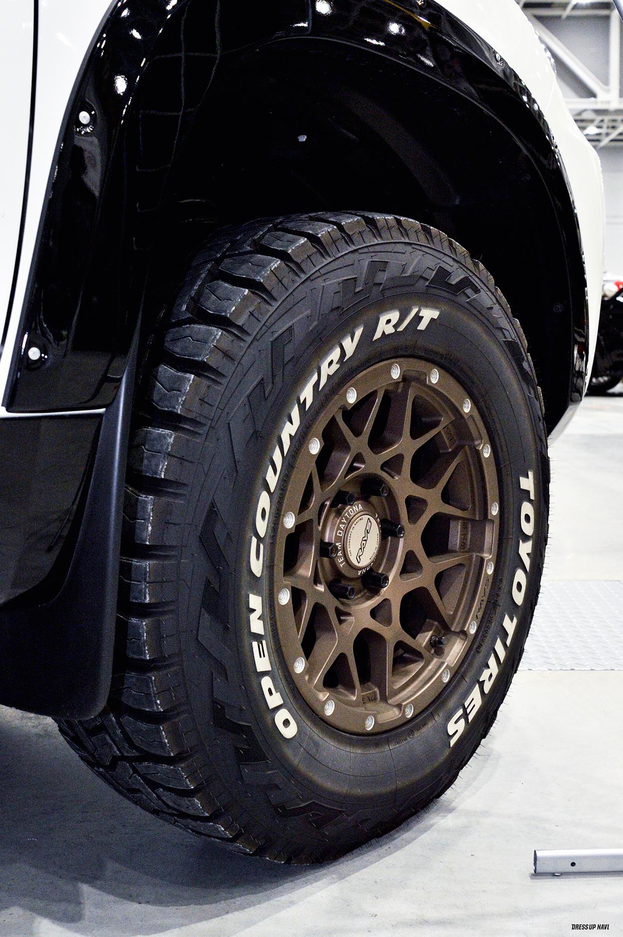 オフ系ホイールのヒットブランドのひとつである「ナイトロパワー」のハイエースは、オープンカントリーR/Tをセットアップ。人気シリーズのRTタイヤで、トレンドのホワイトレターを採用しているのもポイント。オールテレーンとマッドテレーンのイイトコ取りをしたラギッドテレーンは、一般的なオンロードからアウトドアシーンまで、幅広いシーンでの使用を想定。さらに、商用車の車検にも対応するC規格タイヤというのもハイエースユーザーに選ばれている理由のひとつだ。ナイトロパワーのH12ショットガンと共に、実用性とスタイリングを兼ね備えたコーディネイトになっている。
