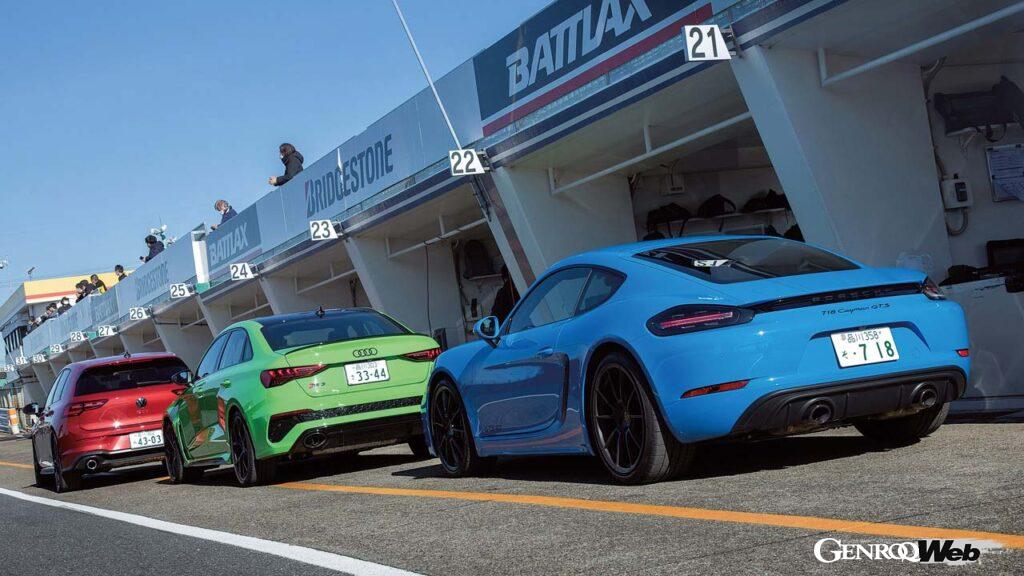 手前からポルシェ718ケイマンGTS4.0、アウディRS3セダン、フォルクスワーゲン・ゴルフGTI。駆動方式もボディ形状も多彩なコンパクトスポーツモデル3台だ。