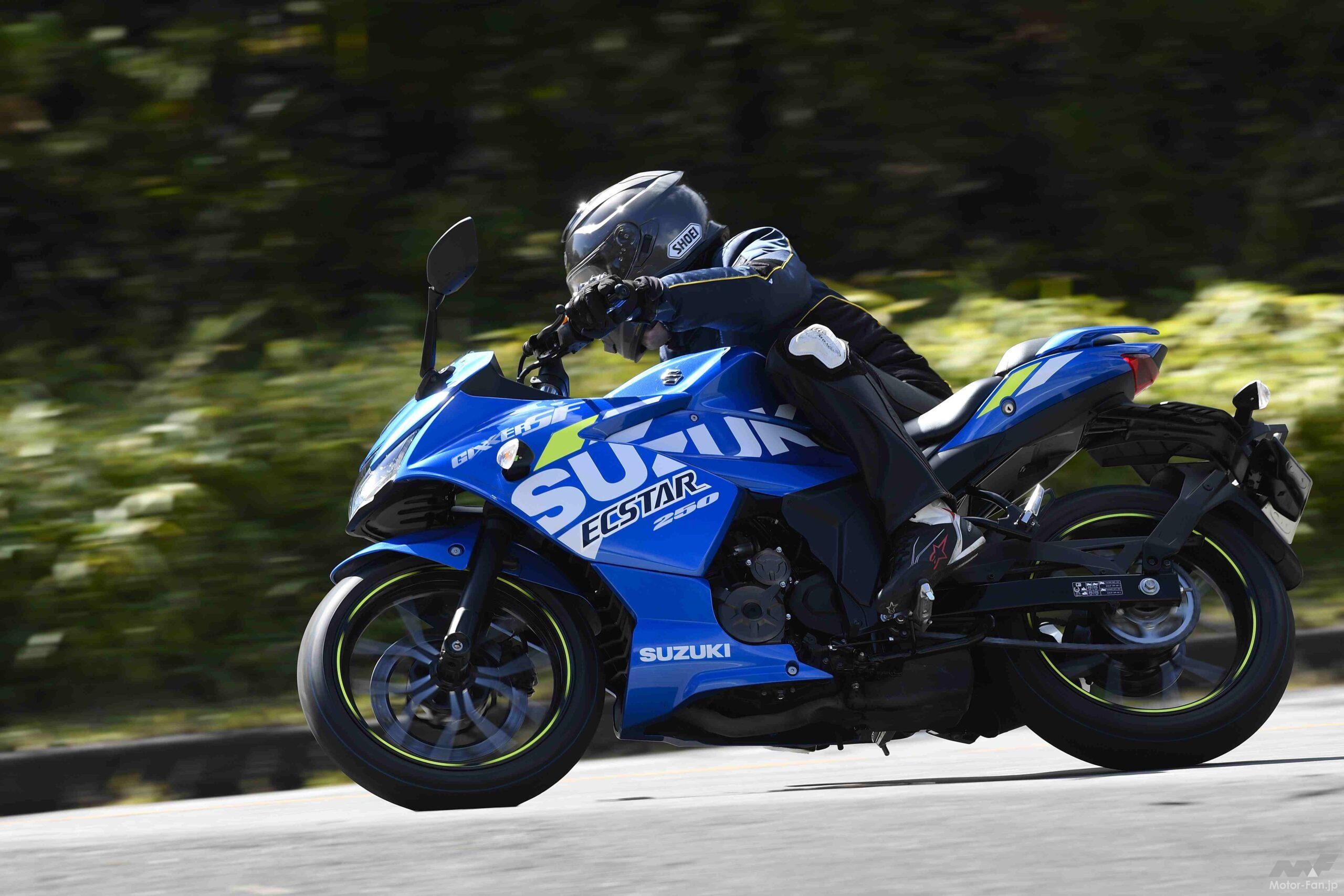 近年の250ccフルカウルスポーツ市場で、スズキはライバル勢とは方向性が異なる、独自の道を歩んでいる。その状況が把握できる材料として、カワサキが2008年に発売したニンジャ250Rに端を発する、日本製250ccフルカウルスポーツの最高出力・エンジンの気筒数・装備重量を以下に記そう(数値はいずれも初代のベーシック仕様)。