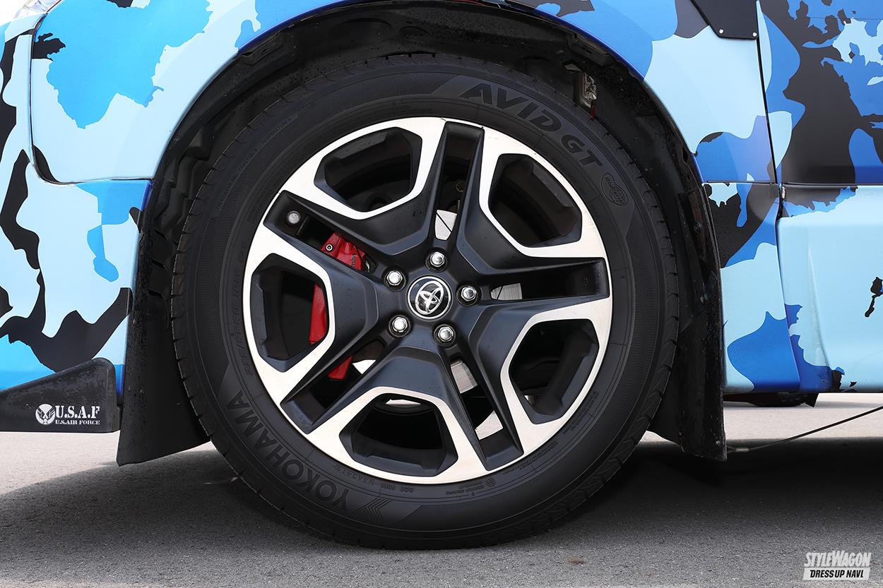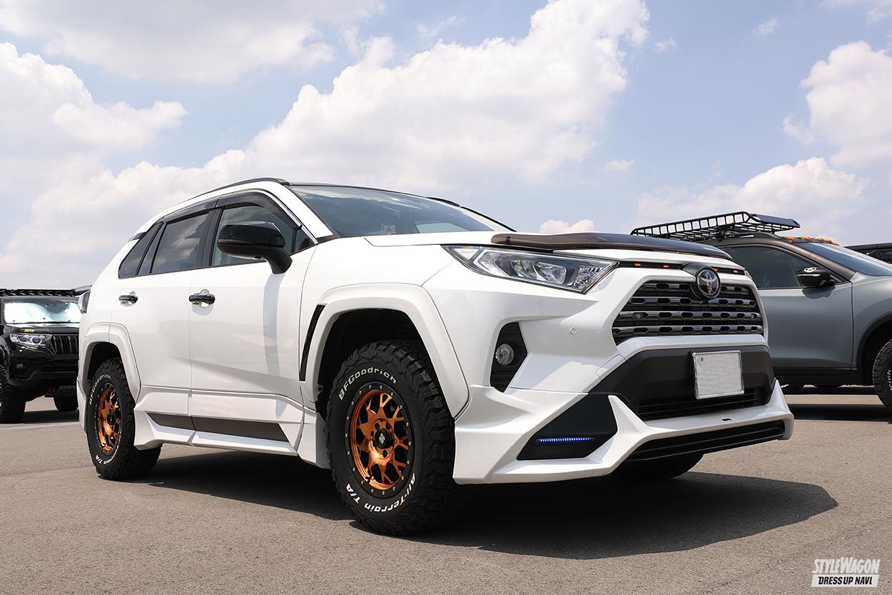 クルマの乗り換えを検討している中で、カタログを見てRAV4にひと目惚れしたというShunさん。RAV4と相性抜群だったのだろう。その時はカスタムをするつもりはなかったが、RAV4の集まりに行ったのがきっかけで……。「最近換えたばかり」というホイールに注目! 白いボディ色にこのオレンジ、目立ちまくっています!!