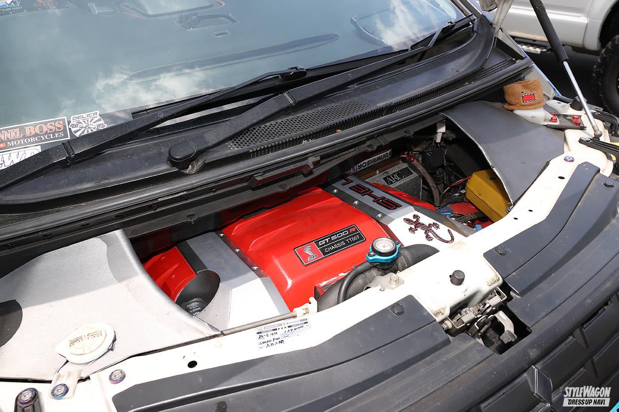 自分で貼り込んだラッピングも見どころだが、エンジン関係に注目! ボンネットを開けると、縦置きエンジンを連想させるカバーが出現。そしてエンジンをかけ、とある秘密のスイッチをONにするとV8サウンドが轟くのだ。エンジンルーム、ボディサイドに仕込んだスピーカー&専用ユニットが、V8サウンドを生み出す!!