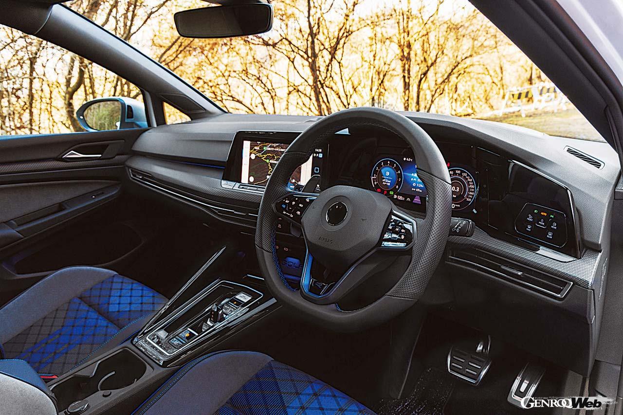 試乗車のエクステリアは先述の19インチ径ホイールを装着していたが、フロントではR専用のバンパースポイラーを採用。一方リヤではテールゲートの中央部分へと装着位置が変更されたRのエンブレムや4本出しのエキゾーストシステムにグロスブラック仕上げのディフューザーなどの、これも専用のアイテムが誇らしいRのフィニッシュだが、ゴルフRの運動性能を考えれば当然ともいえるチューニング。これもまた先代と比較して1インチ拡大された18インチ径のブレーキシステムには、Rのロゴをあしらったブルーの対向キャリパーが組み合わせられるが、そのタッチがとてもナチュラルな印象だったのが、試乗を始めて最初に感じたことだった。