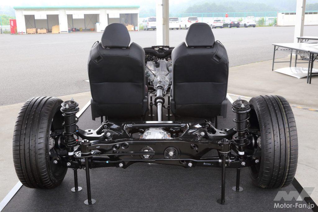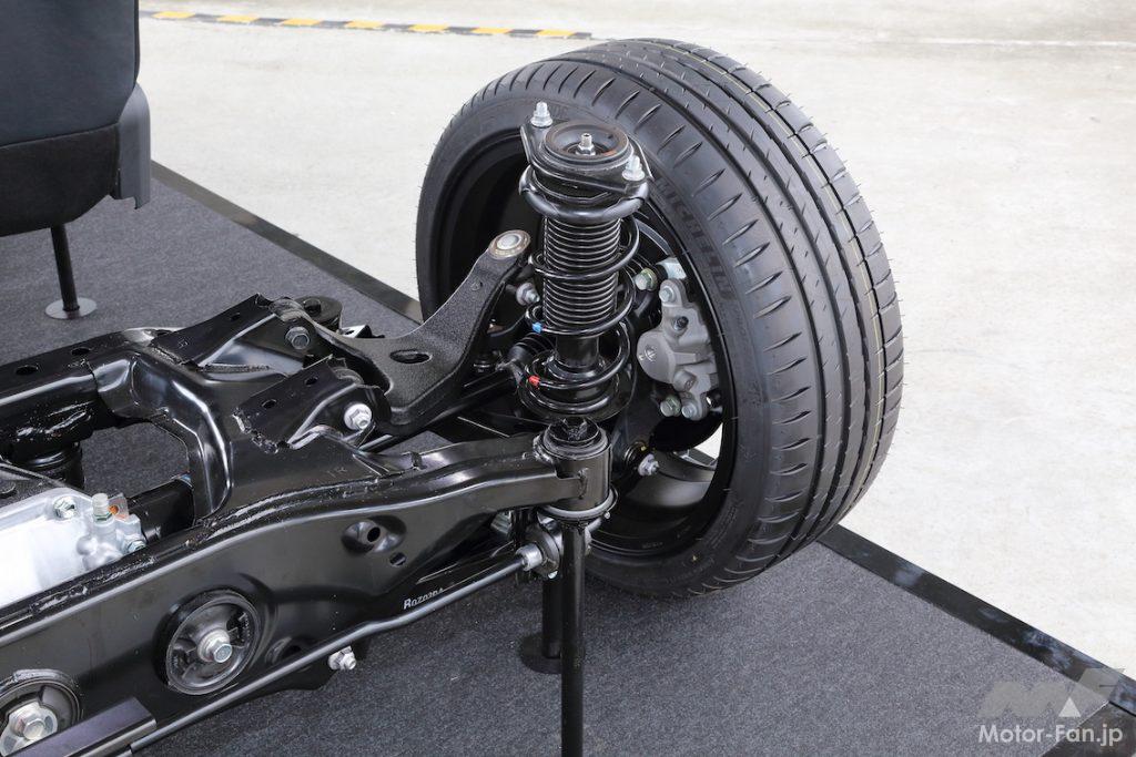 当初、GR 86とSUBARU BRZはダンパーとEPS(電動パワーステアリング)の適合違いで差別化を図る予定だったという。ところが最終的には、エンジンECUの特性とフロントハウジング(ナックル)、リヤスタビライザー(アンチロールバー)の締結方法、前後スタビライザー、リヤトレーリングアームブッシュ、前後コイルスプリングを独自に設定することになった。これらの結果、まるっきり反応や動きの違うクルマに仕上がったのである。
