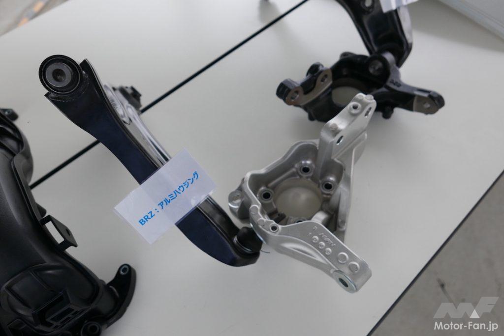 いっぽう、GR 86はわざわざスチールのフロントハウジングに戻した。ステアリングを切り込んだ際に手に伝わるフィーリングを重視しての判断である。「ダイレクトに動く感じはアルミよりスチールのほうがある」(担当技術者)というのだ。フロントスタビライザーはBRZが中空(18.3φ)なのに対し86は中実(18φ)で、当然、中空のほうが軽い。だが、「リニアな利きが欲しかったから」と、86は中実を選択した。