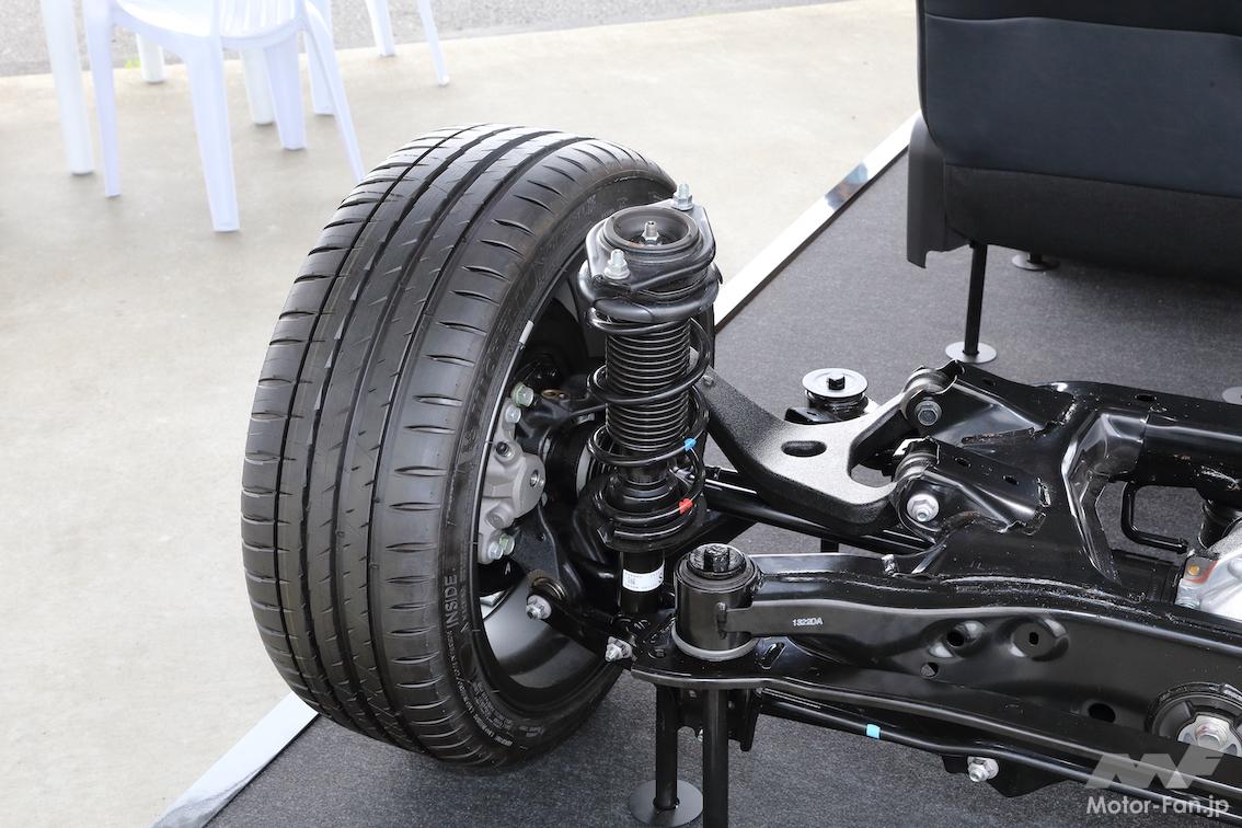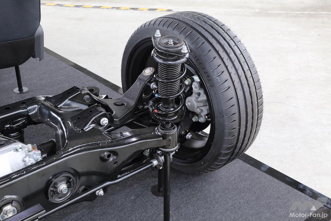 当初、GR 86とSUBARU BRZはダンパーとEPS(電動パワーステアリング)の適合違いで差別化を図る予定だったという。ところが最終的には、エンジンECUの特性とフロントハウジング(ナックル)、リヤスタビライザー(アンチロールバー)の締結方法、前後スタビライザー、リヤトレーリングアームブッシュ、前後コイルスプリングを独自に設定することになった。これらの結果、まるっきり反応や動きの違うクルマに仕上がったのである。