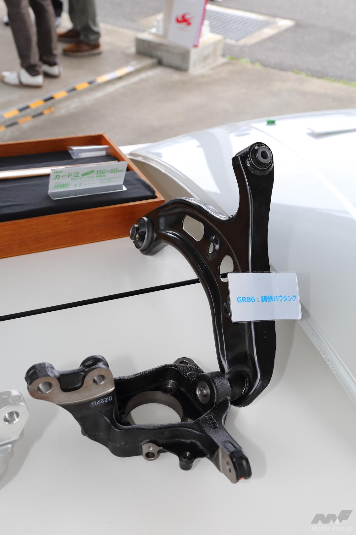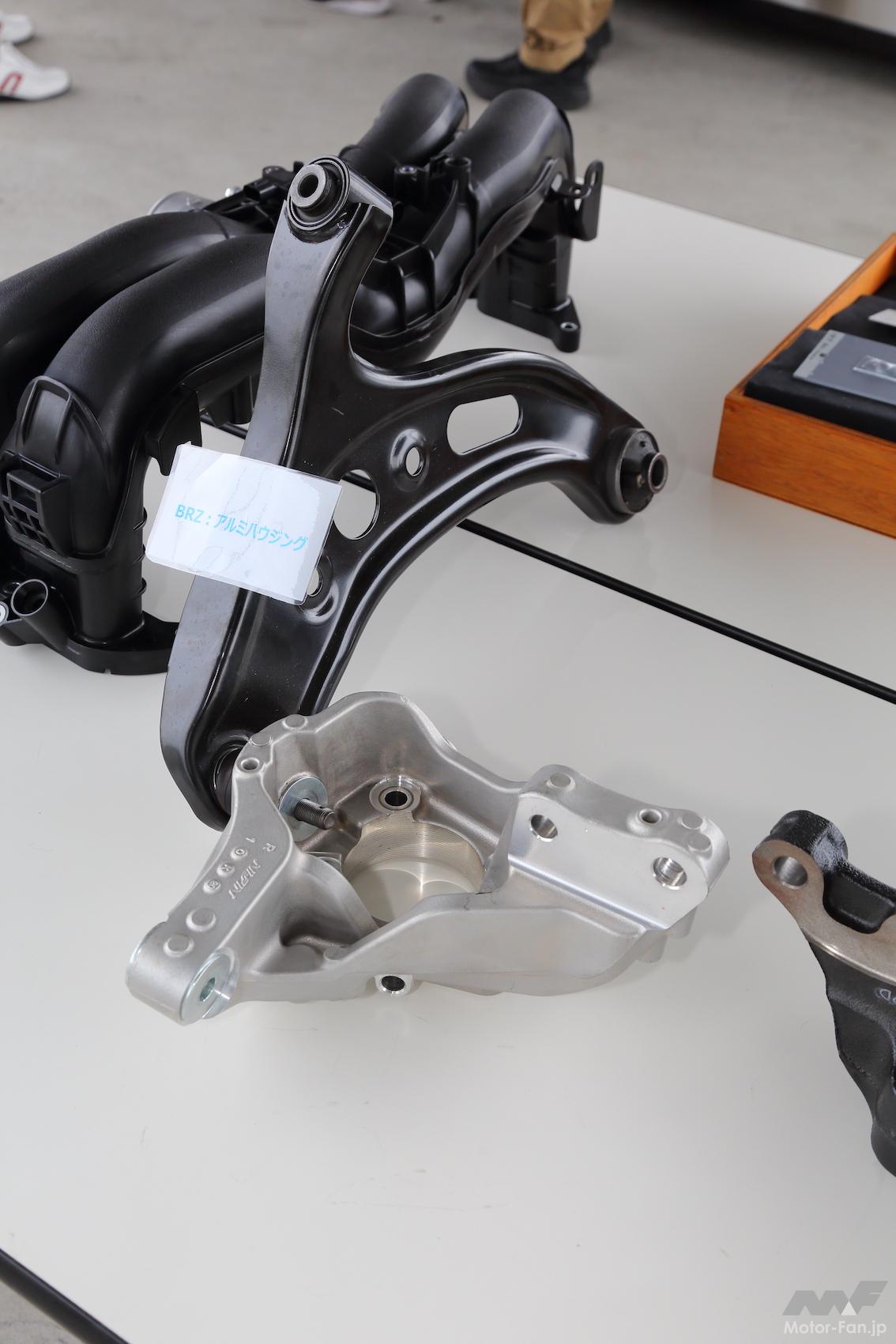 いっぽう、GR 86はわざわざスチールのフロントハウジングに戻した。ステアリングを切り込んだ際に手に伝わるフィーリングを重視しての判断である。「ダイレクトに動く感じはアルミよりスチールのほうがある」(担当技術者)というのだ。フロントスタビライザーはBRZが中空(18.3φ)なのに対し86は中実(18φ)で、当然、中空のほうが軽い。だが、「リニアな利きが欲しかったから」と、86は中実を選択した。