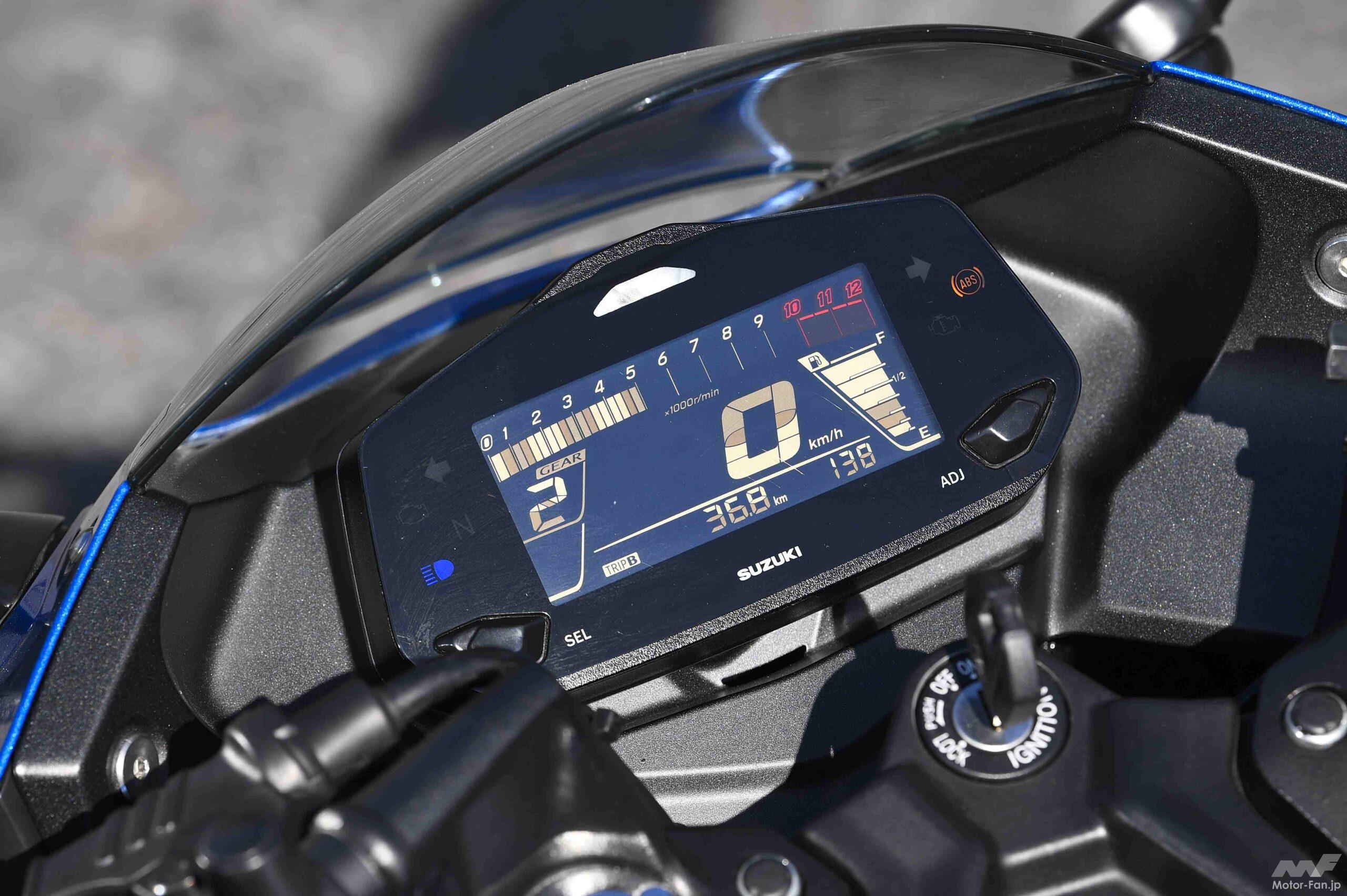 近年の250ccフルカウルスポーツ市場では、セパレートハンドルをトップブリッジ下にクランプする車両が増えているけれど、万能性を重視するジクサーSF250はトップブリッジ上。ちなみにネイキッド仕様のジクサー250のバーハンドル幅は、SF+65mmとなる805mm。モノクロ液晶メーターはジクサー150と共通のデザインだが、表示をポジ→ネガに変更。上部のシフトタイミングランプは、4000~10000rpmの間で500rpm刻みの設定が可能。