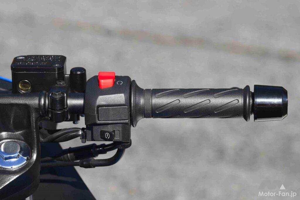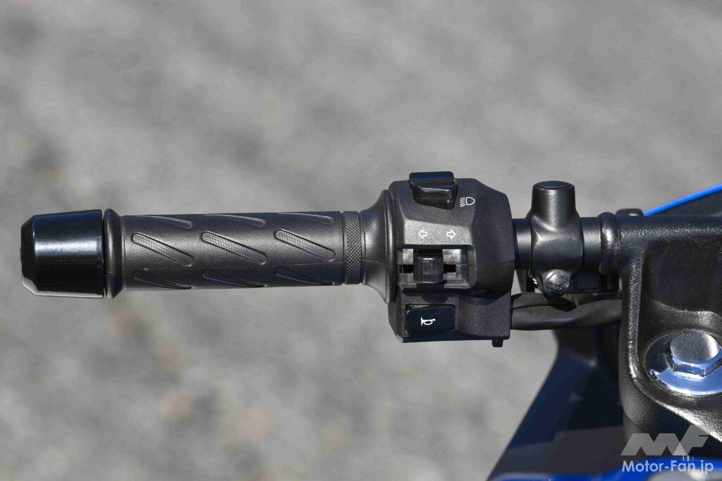 左右スイッチボックスはオーソドックスな構成で、レバー位置調整機構はナシ。クラッチレバー基部を保護するラバー製ブーツは、現代の250ccフルカウルスポーツではスズキ車のみが採用。バーエンドウェイトはかなり重そうだが、高回転域ではそれなりに振動が発生する。