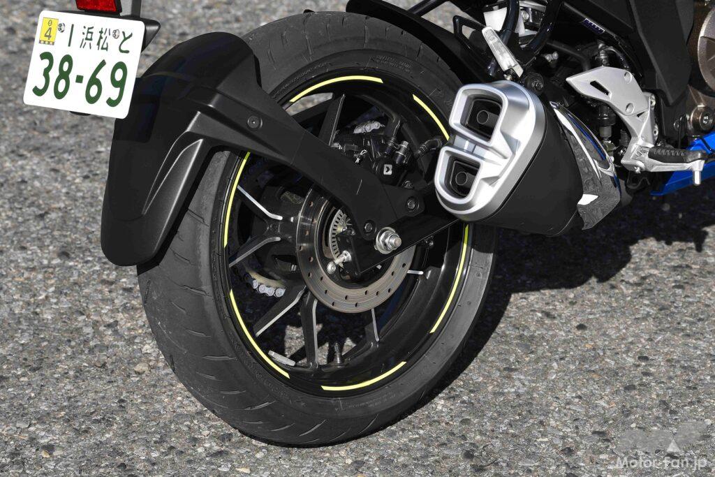 前後タイヤはラジアル。生産国のインド仕様がMRF REVZ-FCを履くのに対して、日本仕様はダンロップGPR-300を採用。