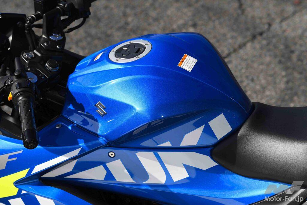 ガソリンタンク+左右カバーは抑揚に富んだ造形で、ライダーの内腿と接する後端はギュッと絞り込まれている。シートは前後とも十分な面積と肉厚が確保されているけれど、メイン部の形状が前下がりであることが、個人的には残念。もっともロングランの前半やスポーツライディング中は、座面形状は特に気にならなかった。