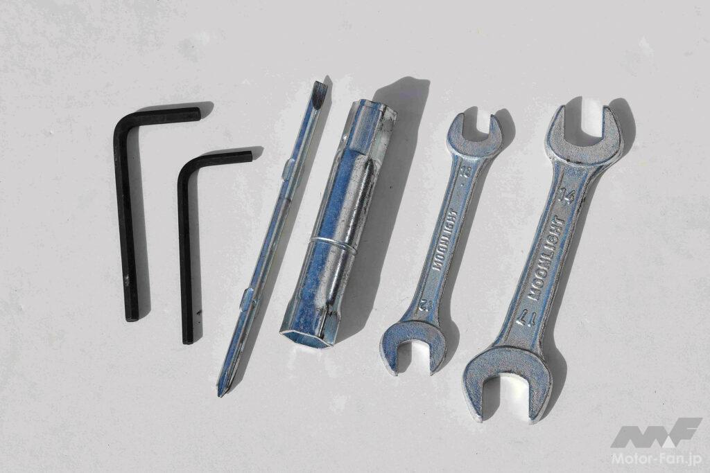 タンデムシート下に備わる車載工具は、両口スパナ×2、L型六角棒レンチ×2、差し替え式ドライバーの5点で、現代の250ccフルカウルスポーツの基準で考えると少ない部類。残念ながら、リアショックのプリロードを調整するフックレンチは備わっていない。