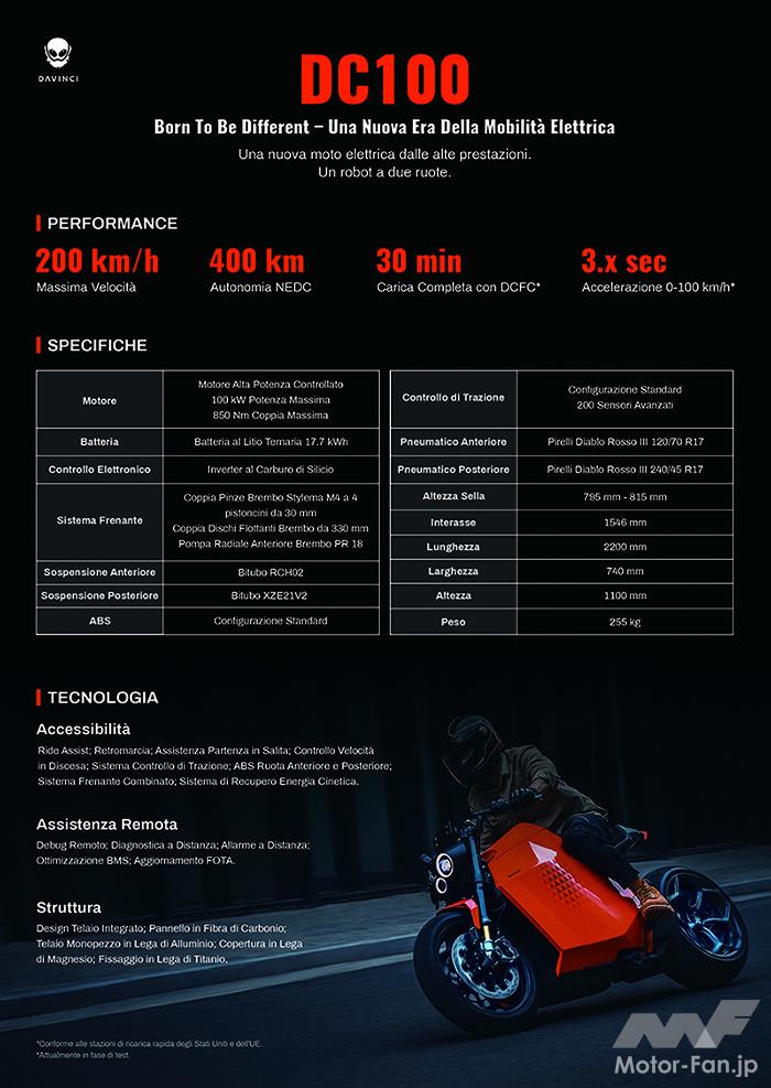 ダビンチ・モーターはEICMA2022においてDC100を展示し、EU市場に向けて本格的に展開することを発表。価格は2万6000ユーロ(日本円換算で約377万円)。