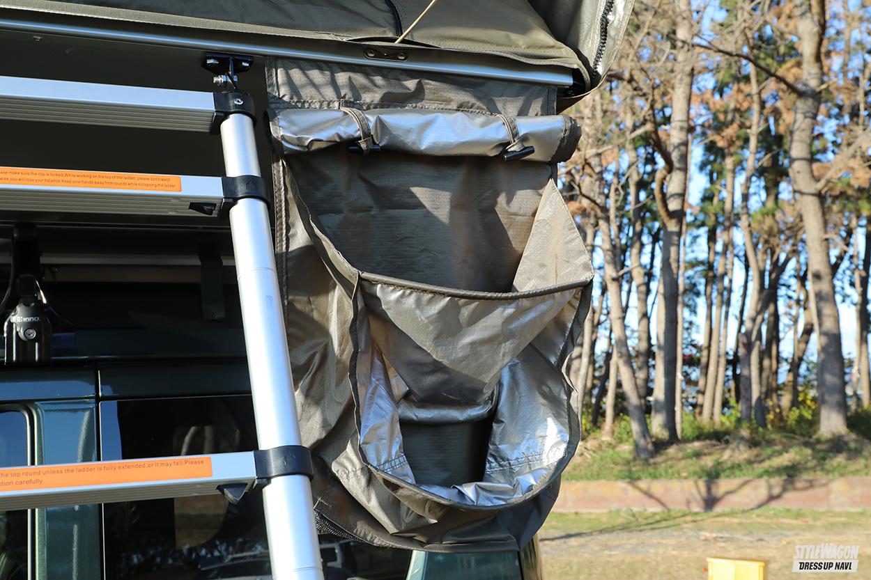 テント内は展開時、Sサイズであれば2100×1520㎜、Lサイズが2100×1900㎜とそれぞれゆったりで、Lサイズなら大人2名+子供2名が就寝できる設計。テントへエントリーするためのハシゴも付属しており、テント内には靴入れも装備する。