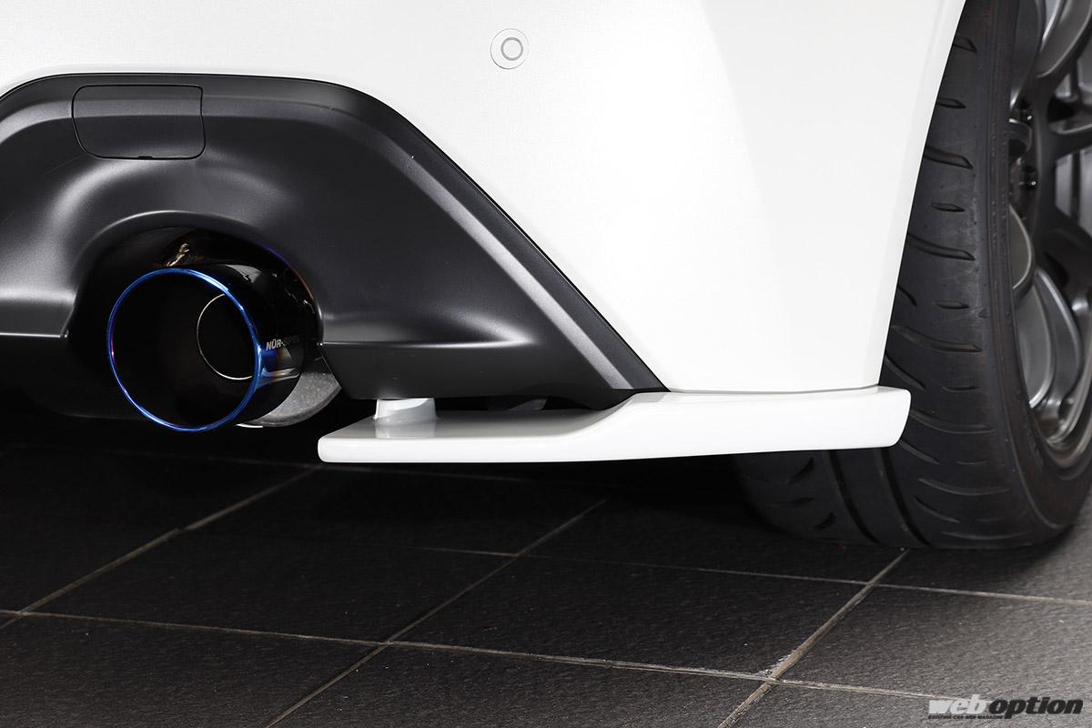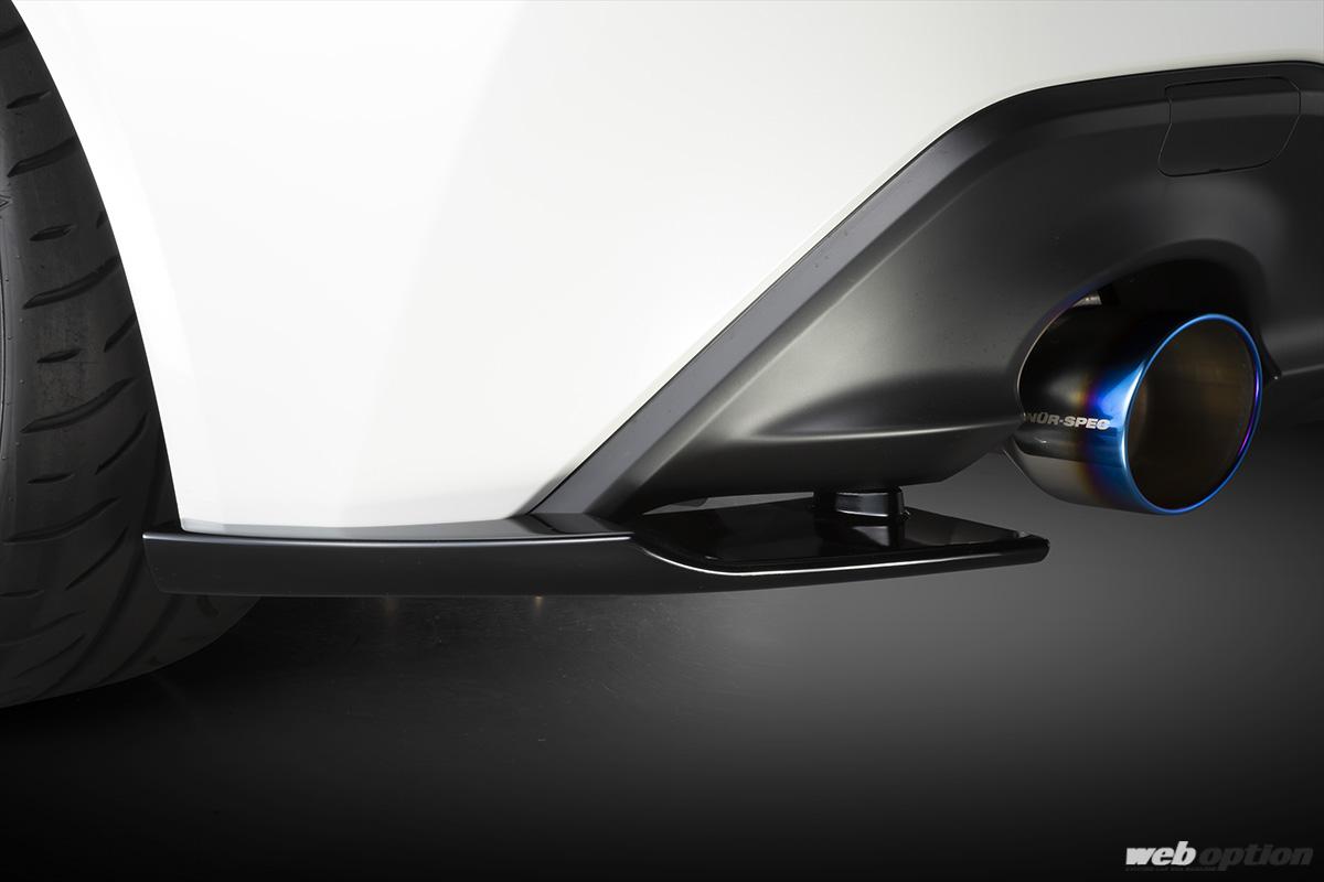 リヤにはサイドディフューザー(4万9500円)とウインドウガーニッシュ(3万8500円)を設定。複雑なデザインながら、GR86/BRZのキャラクター性を損なわないバランス感覚はさすがブリッツだ。
