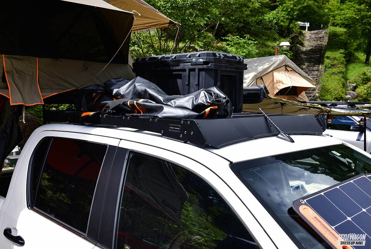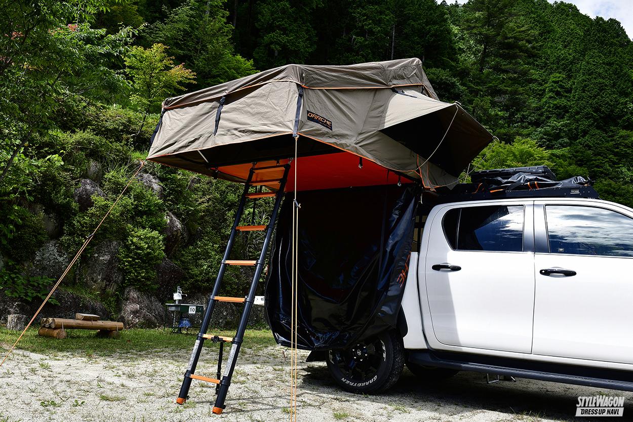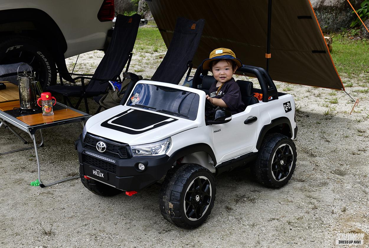 キャンプに挑戦したくて、ハイラックスを新車で購入した濱田さん。スノーピークのテントを愛用していたが、その後長男の遵永くんが誕生。「小さな子がいてもキャンプできるように」、設営がラクなルーフトップテントに変更。一般的なテントと比べ、ペグ打ちなど設営時間を大幅に削減することができた。テントはSNSで見て気に入ったダーチをセレクト。サイドオーニングも同じメーカーで統一。