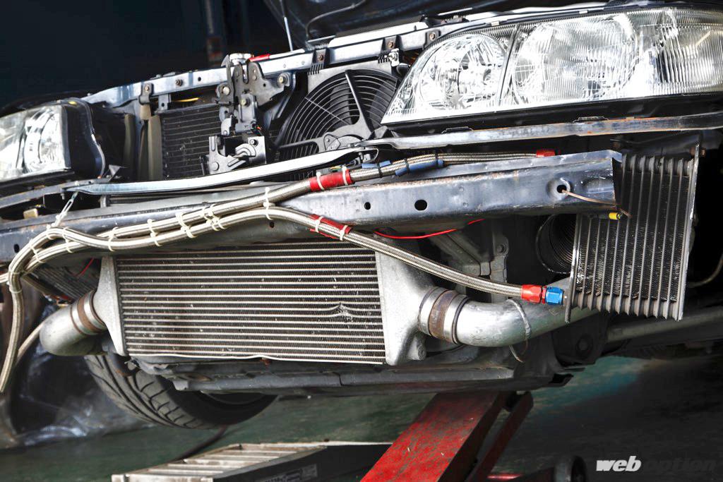 タービン交換と同時に、インタークーラーやオイルクーラー等はサイズや位置をイチから見直した。エンジンルームのスペース確保が難しく、タービンやクーリングのレイアウトには相当苦労したそうだ。