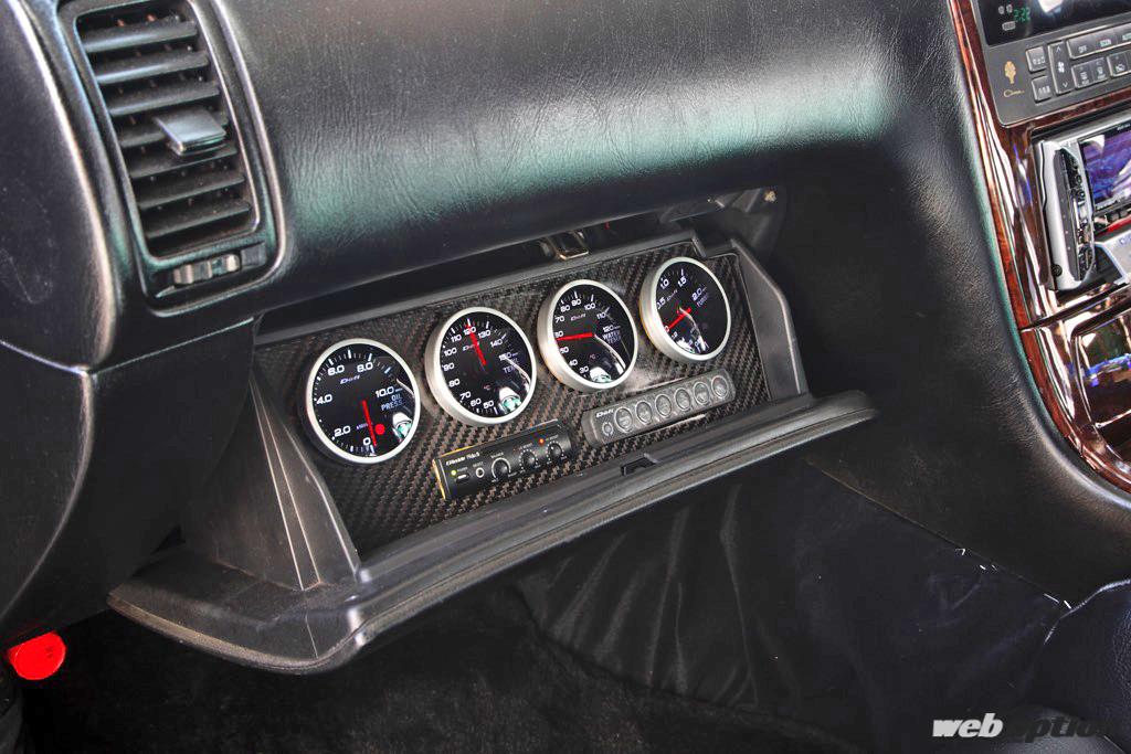 車内には追加メーターがセットされているのだが、その場所はグローブボックス内。閉じれば至って普通のシーマのダッシュ周りになるわけだ。オーナーが“これみよがし”でない仕上げを狙っているのは、こうしたメイキングからも見て取れる。