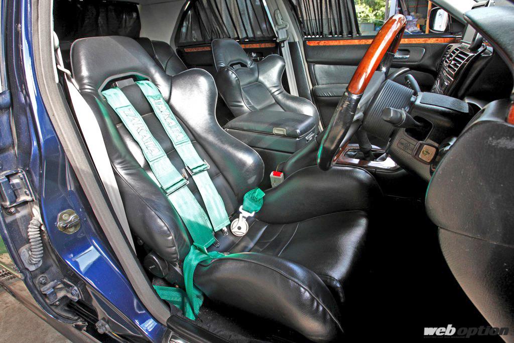 シートはブリッドのセミバケ2脚を使用。ただ装着するのではなく、ドアパネルなどと一緒にレザー張りで仕上げているのがポイント。さらに、ダッシュボードなどの樹脂部をペイントすることで車格に見合った高級感を演出する。