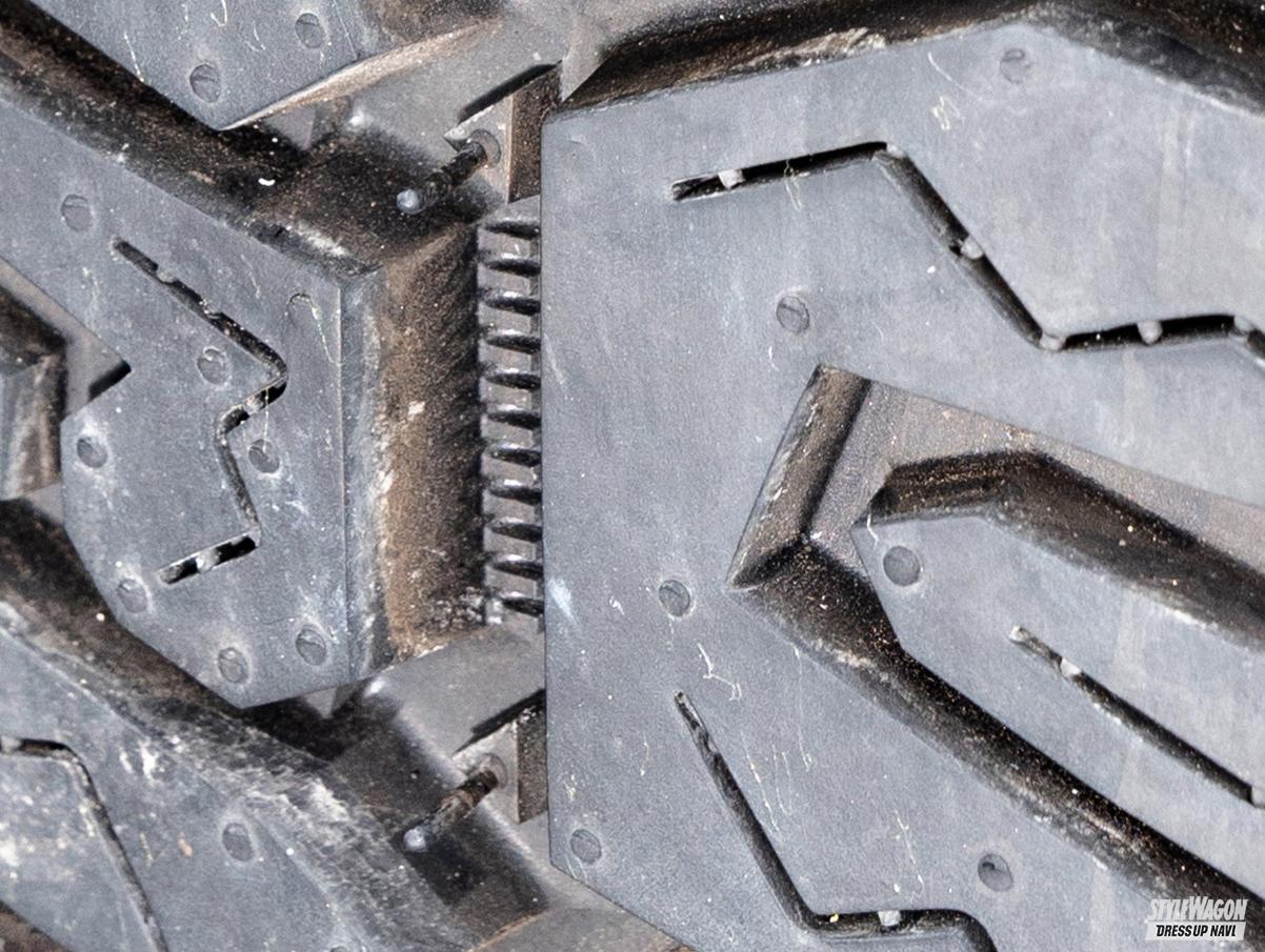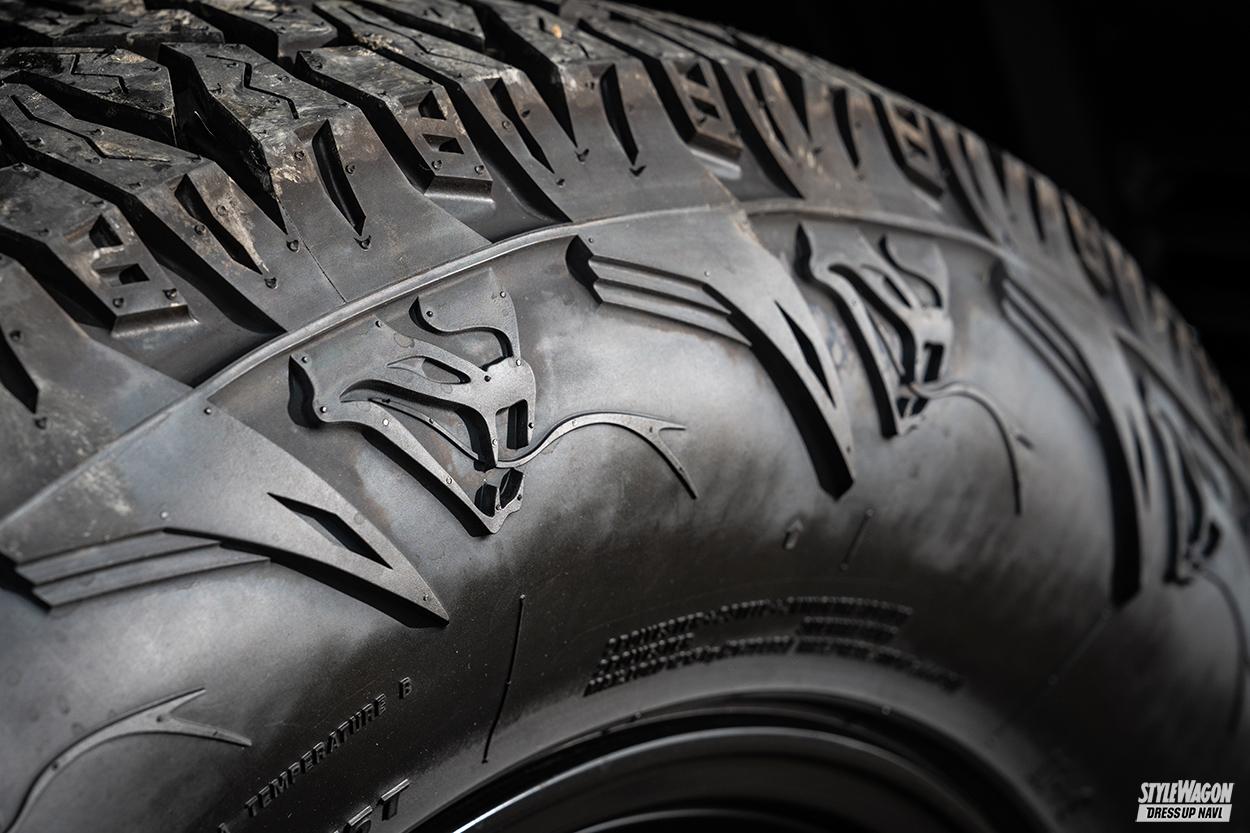 今回は150プラドへ17インチの265/70をセットアップ。足元の力強さを高めるタフネスなブロックデザインを核として、ショルダーには牙をむいたようなスネークデザインを採用。立体感の強いレイズドブラックレターと合わせてタフネス感抜群。そんなイメージ通り、悪路走派性の高さはもちろんのこと、気になる市街地での走行も、そのルックスとは裏腹に静粛性が高い。オフタイヤ独特の「コーコー」というロードノイズが極力抑えられているのがわかる。オン/オフで相反する性能が、高次元でまとめ上げられた一本なのだ。