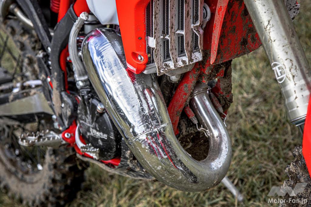 2023年モデルの125は、エンジンにも大幅な改良が施されている。2022年モデルより軽いフライホイールと、小径クランクシャフトを採用しエンジン内部の慣性重量を低減。レスポンスの向上と、素早いアクセルワークに反応するようになった。それに伴ってクランクケース内のボリュームを最適化させるために、新型のケースへ変更されている。また排気デバイスであるパワーバルブも、エンジン改良に伴って最適化されている。2サイクルマシンの中で、この125だけがキック始動オンリーと混合燃料となる。つまり、セルモーターやバッテリー、分離給油のオイルタンクなどが無い訳であり、シンプルな構成となっているのだ。