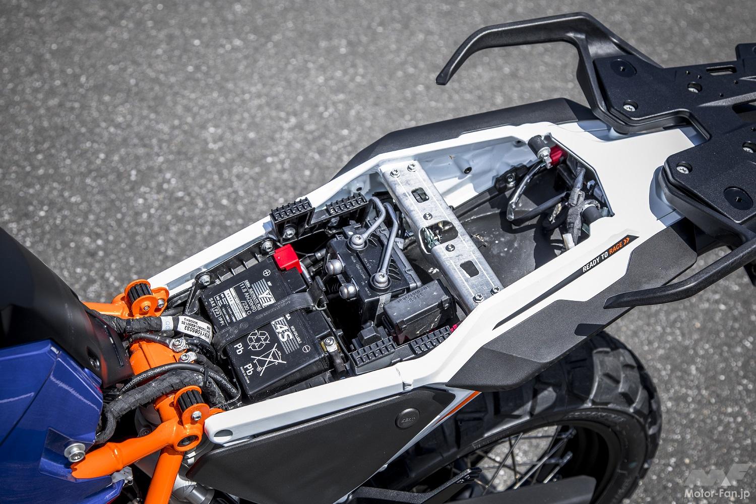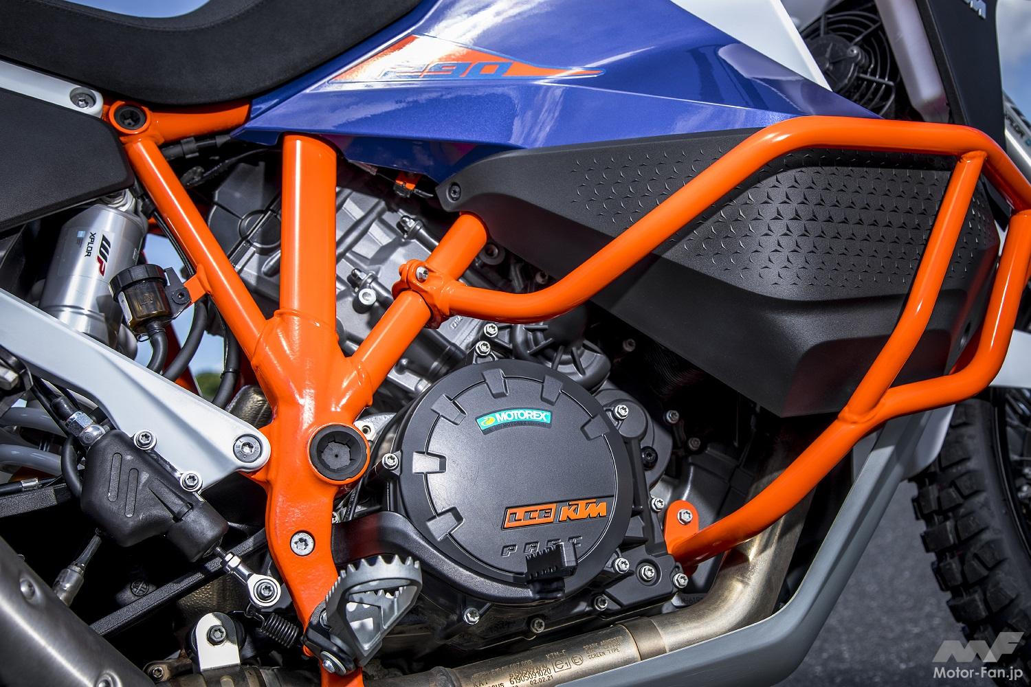フレーム構造や搭載エンジンは基本的に本誌掲載済みのスーパーアドベンチャーSと共通。Rのフレームはコーポレートカラーのオレンジ色で、リヤのサブフレームは白が組み合わされている。渋い黒で統一されたSと比較すると、Rはワイルドな仕上がりを誇っている。左右に振り分けられたガソリンタンクの両サイドをガードするオレンジのクラッシュバーも標準装備だ。