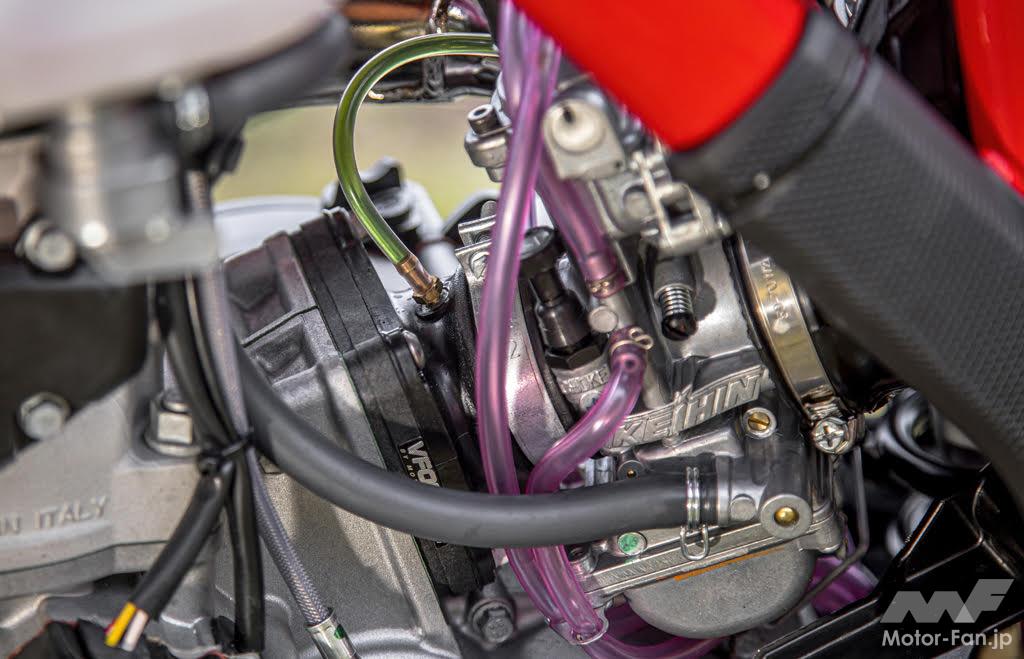 エンジンのボア・ストロークは66.4mm×72mmとロングストロークとなっている。圧縮比は13.2:1と2サイクルとしては高圧縮比。このロングストロークと高圧縮比は何を意味するのか。