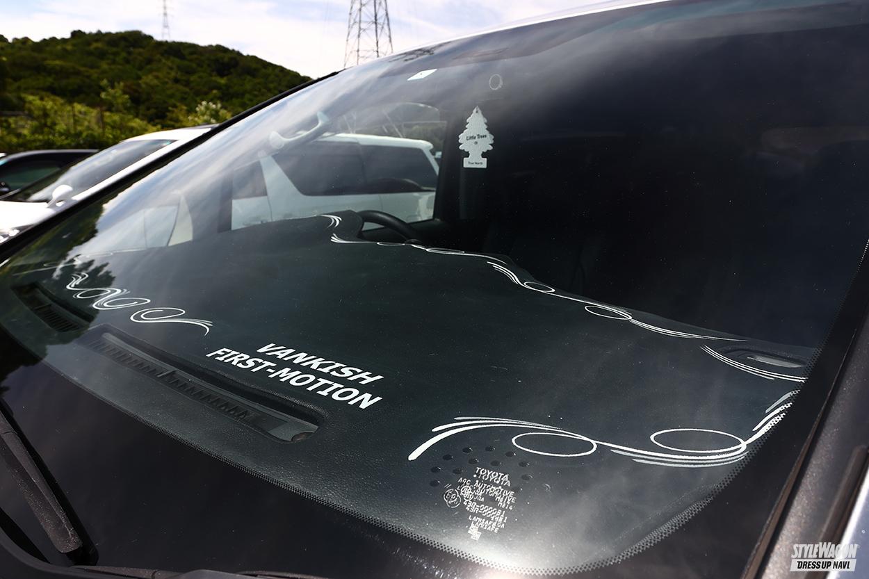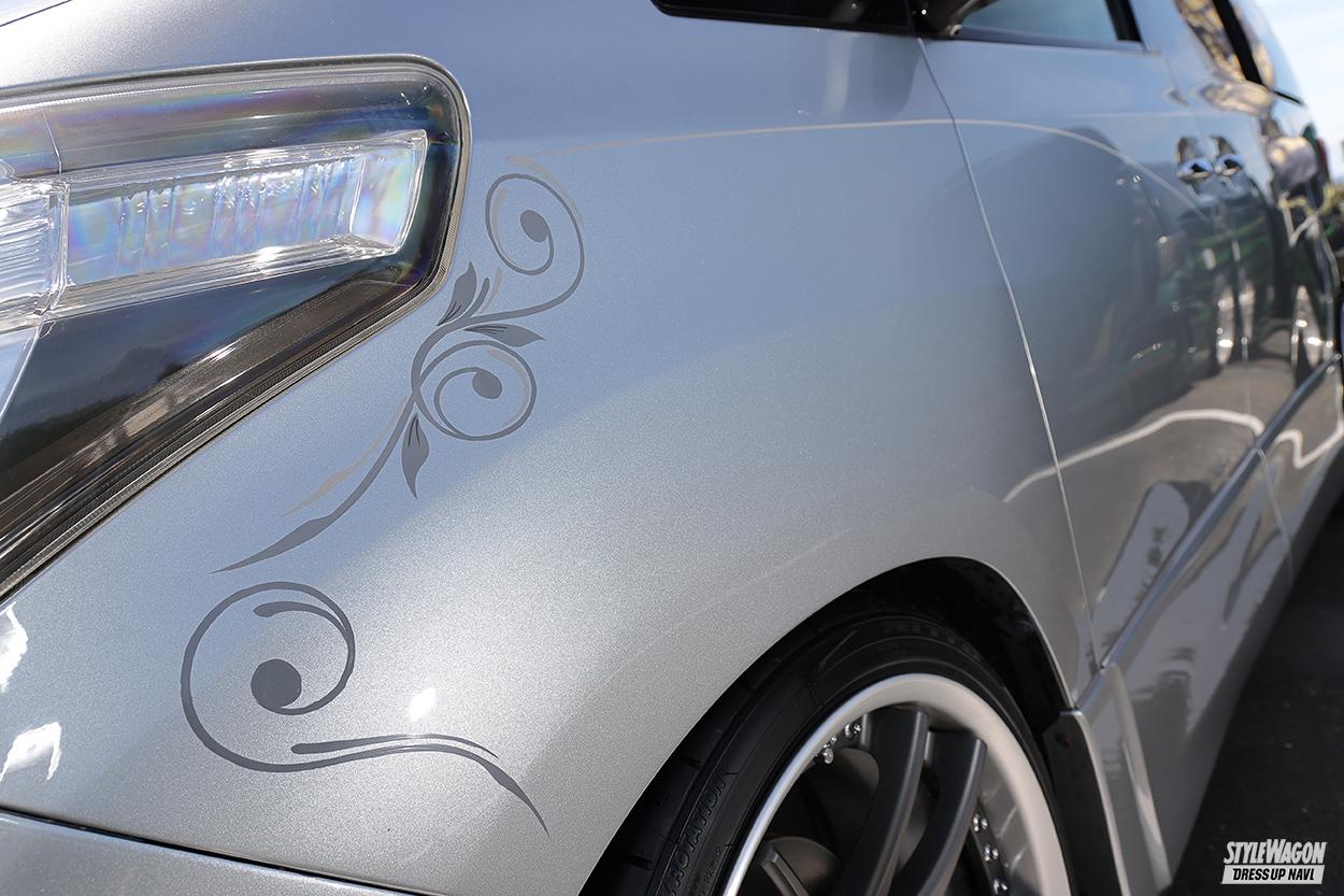 Suzuさんの愛車の傍を通り、まず化粧ナンバーのピンストライプに気付いた! よ〜く見ると、ボディサイドにも職人さんの手によるピンストライプがあるし、ダッシュマットにも!! これ見よがしではなく、あくまでさり気なくピンストライプがあしらわれていたのだ。バリバリ目立つというワケではないんだけど、多くの来場者がソレに気付き、興味深げに覗き込んでいた。フロントバンパーはナンバーポケットに至るまでスムージングし、ボンネットは3Dペイントと、細部までジックリ見るとジワジワ沁みる……、そんな奥深い仕上げが光るアルファードだった!