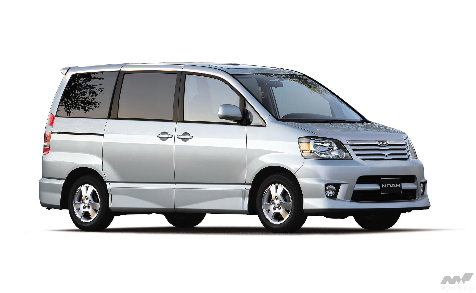 ノアは、その先代にあたる「タウンエースノア」「ライトエースノア」を引き継ぐ形で2001年に誕生した。同様にライトエースを引き継いだのがヴォクシーである。ライトエース、タウンエースと言えば商用バンのイメージが非常に強かったが、その名前が外れたことで、一気に商用イメージを脱することになった。ハードウエア上では、ライトエース、タウンエース時代のFRに決別し、低床FFプラットフォームとなったことも大きい。今に続く稀代の大人気ロングセラーミニバン、ノア/ヴォクシー誕生の瞬間であった。