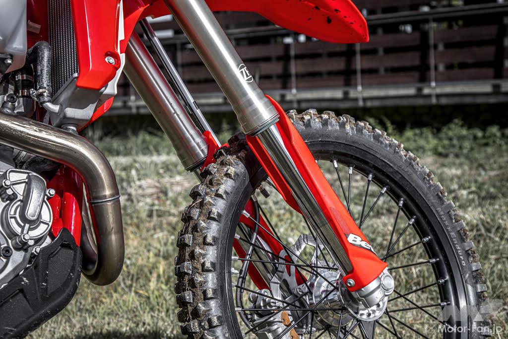 ZF製のフロントフォークは、オイル通路のオリフィスを改善してよいスムーズでプログレッシブな特性へ。リヤサスユニットもZF製で、前後共フルアジャスタブルとなっている。ちなみにストロークはフロント295mm、リヤ290mmと非常に長い。