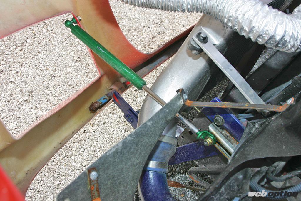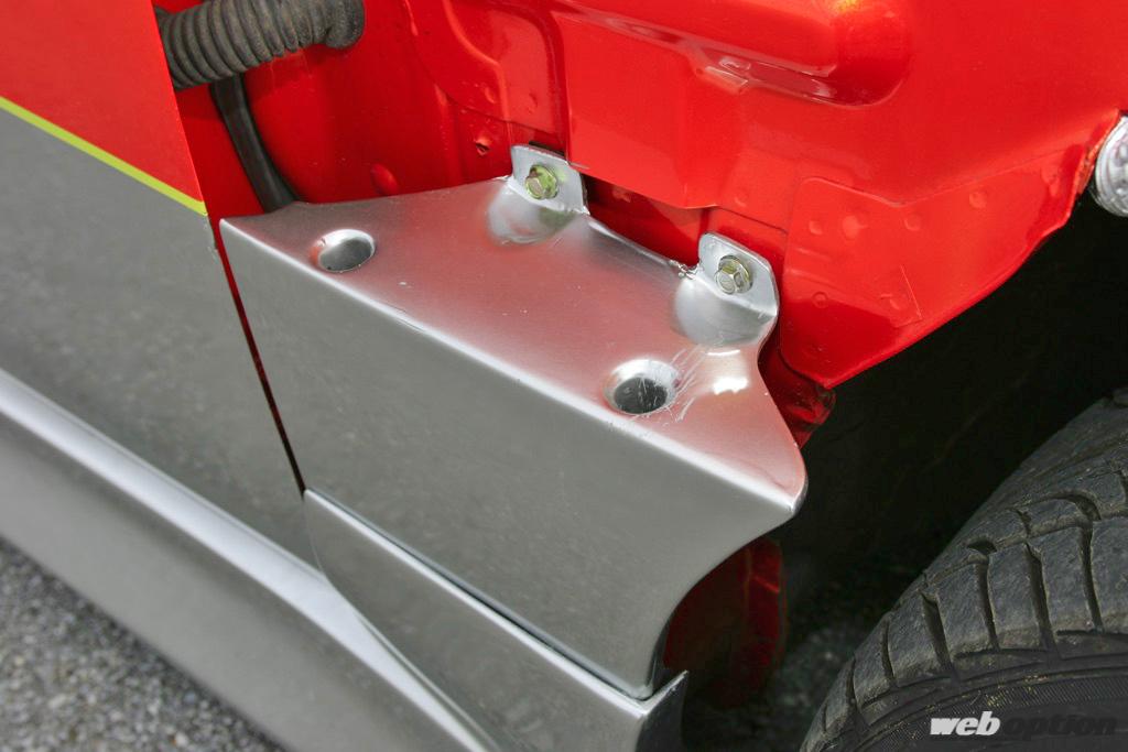 フロントフェンダーごとチルトさせるメカニズムは、まさにフェラーリF40をお手本にして製作。バンパーの下の部分にカウルを可動させる蝶番のようなものを取り付け、90度に開閉させる仕組み。ちなみに構造上、レインフォースは撤去。また、ヘッドライトの光軸調整も可能な構造になっている。