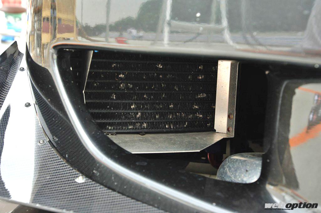 フロントバンパーの右側ダクトには大型のオイルクーラーを設置。ダクト内にはコアまでキッチリとエアガイドを製作し、走行風を無駄なく冷却に使えるようにされている。