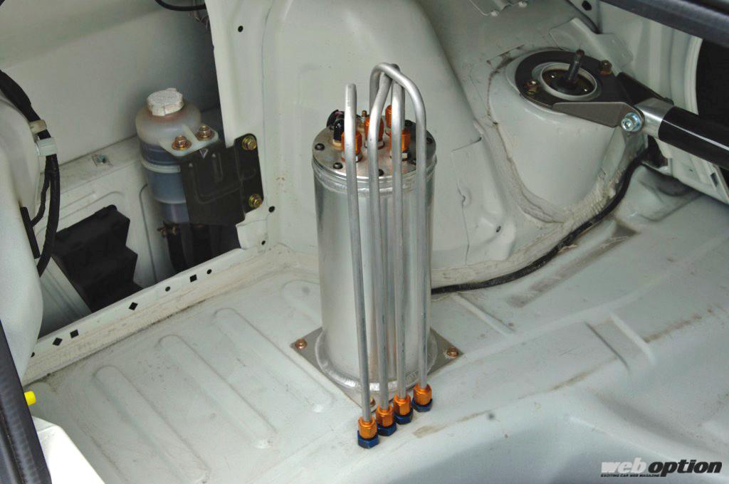また、コーナー旋回中の燃料ポンプからのエア吸い込みによる息つぎ症状を解消するため、トランク内にコレクタータンクを設置。残量が少なくなってもガソリンを安定的に供給できる。ボディの軽い状態でのタイムアタックなどに有利だ。