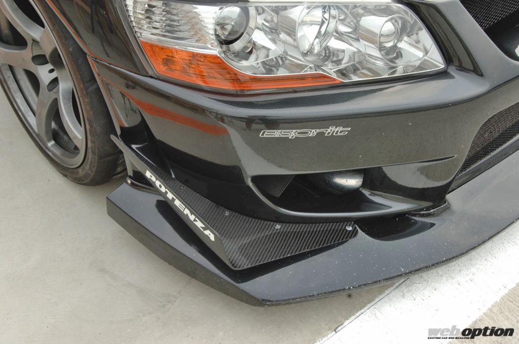 フロントセクションのエアロパーツは空力特性を最優先。Cウエスト製エアロバンパーにリップスポイラーおよび大型カナードを追加し、フロントタイヤの接地性を高める。