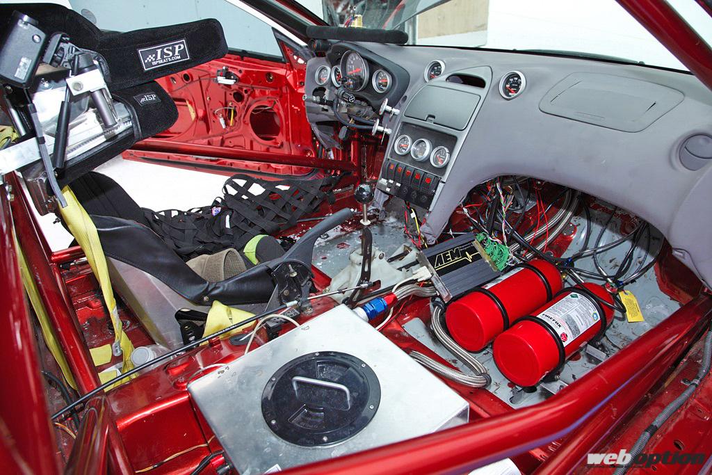 助手席の位置に鎮座する黄色い物体はドライサンプ用オイルタンク。容量が何Lかは聞かなかったけど、とにかくバカでかい。これなら1万rpmレブでも潤滑性能に問題はなさそうだ。