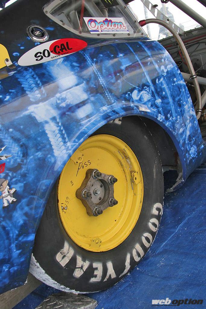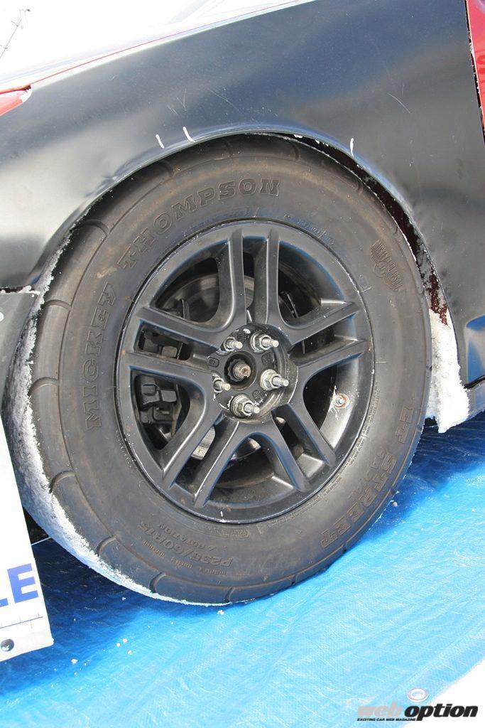 リヤスポイラーは、ゲートにベタ付けのドラッグウイングに翼端板を追加したような形状。減速用パラシュートはお約束のアイテムだ。また、200MPH以下のクラスのため、リヤタイヤはボンネスリックでなくスポーツラジアル。225/50R15サイズのBFグッドリッチGフォーススポーツが装着されてた。
