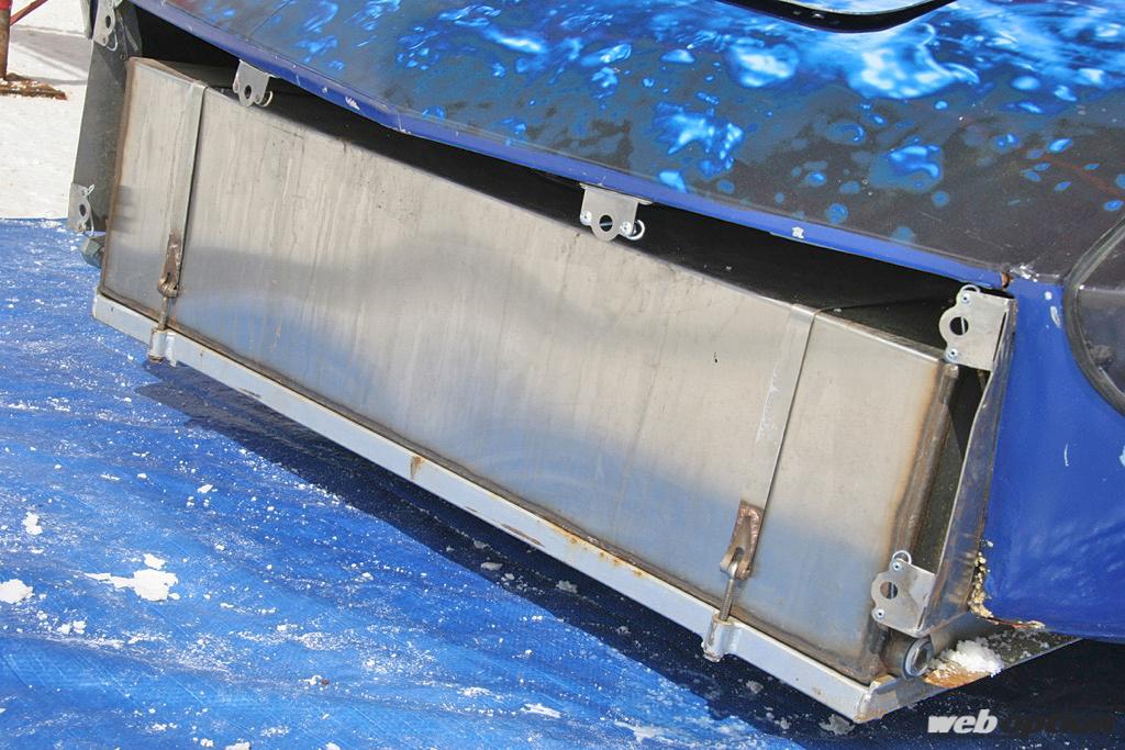 フロントノーズ下部のアルミ製ボックスは水冷式インタークーラー用のタンク。フロントの接地性を高めるウエイトの役割も持っている。