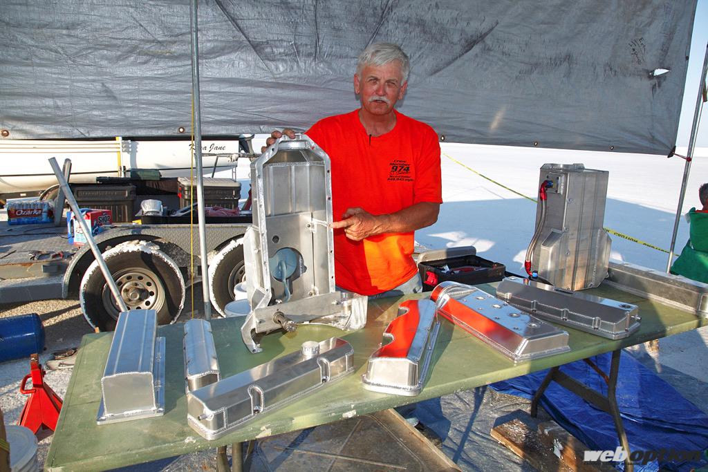 スタッフのダグさんは、マイアミでアルミ製のカムカバーやオイルパンを作るダグリーエンジニアティパフォーマンスプロダクトを経営。マニアックなパーツを色々と見せてくれた。