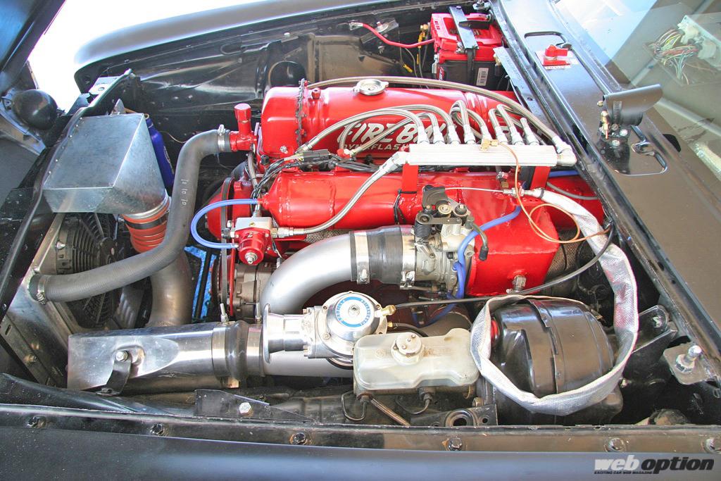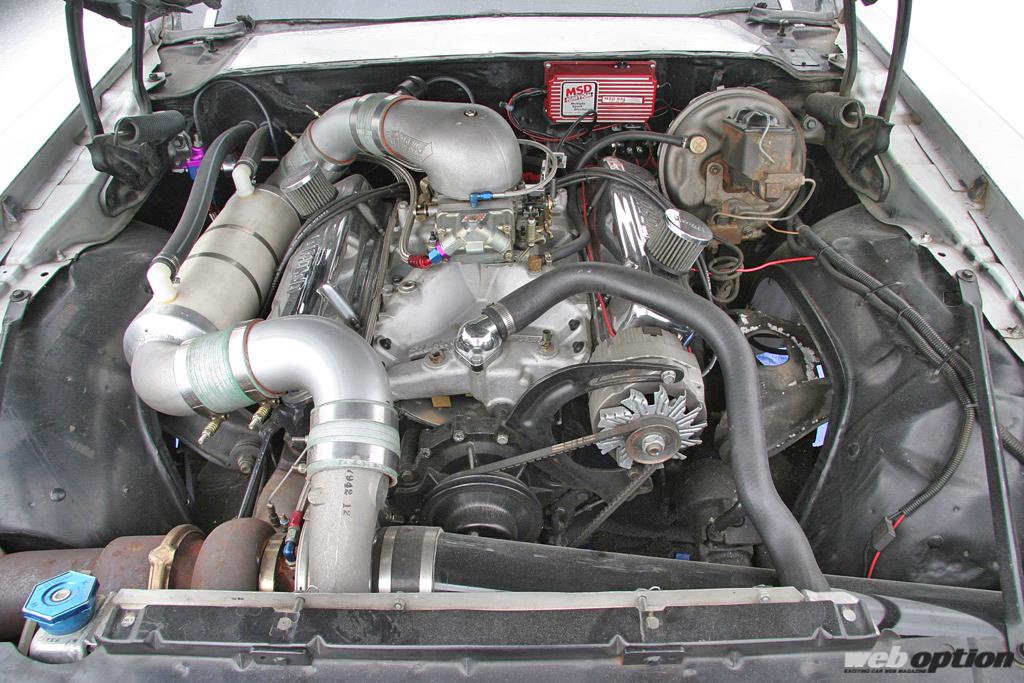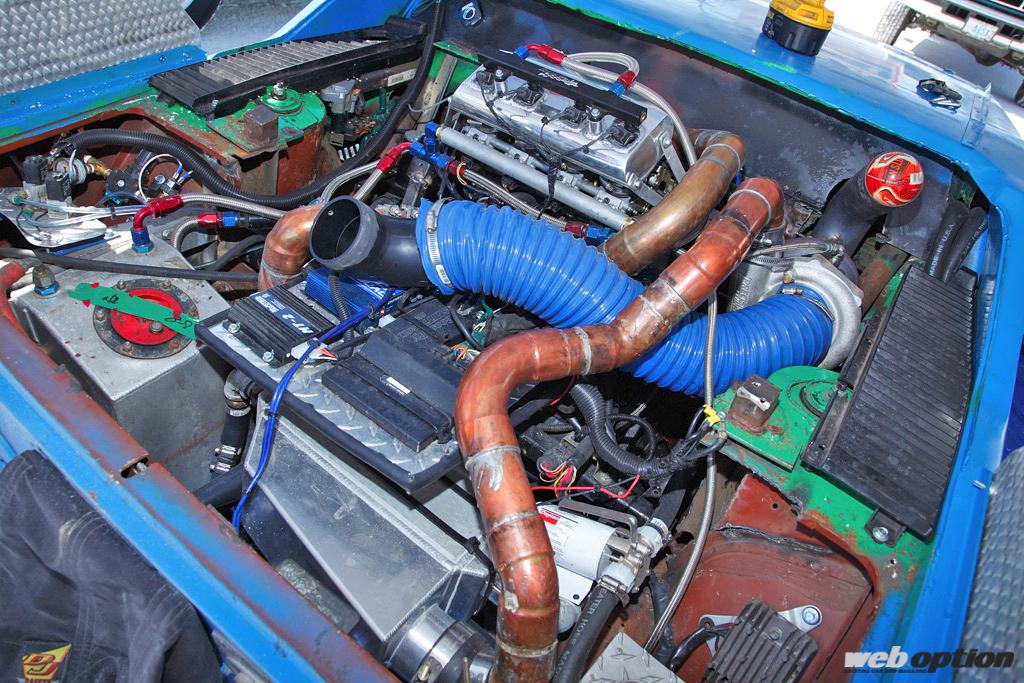 ポンティアックの5817cc(355ci)V8を搭載し、エクストリームベロシティ製タービンキットをエンジンの前方に装着。どうやらボルトオンキットものらしく、パイピングやそのレイアウトに無理がない。左方向に伸びるEXパイプがフロントフェンダーを貫通するマフラーだ。