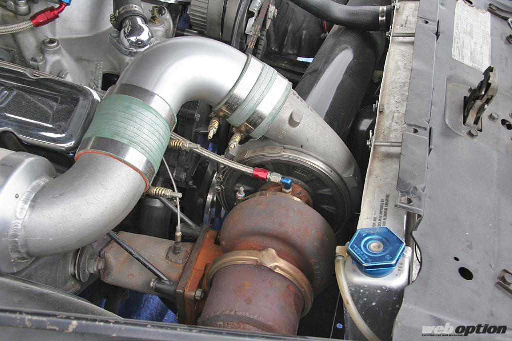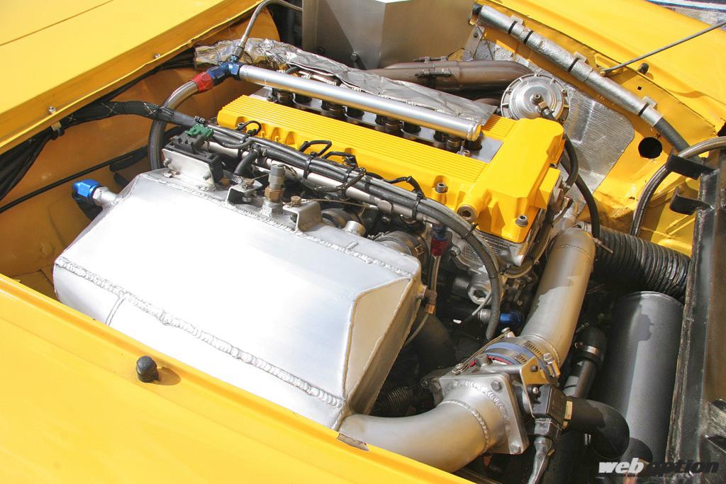 スペースの関係からEXマニを前方に伸ばし、エンジンの左前方にセットされるホルセット製タービン。エンジン制御はデルファイMEFIが担当し、最大ブースト圧1.5キロ時、7100〜8000rpmの領域で550psをマークするなど高回転型に仕上げられている。