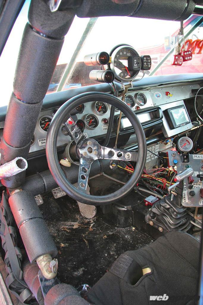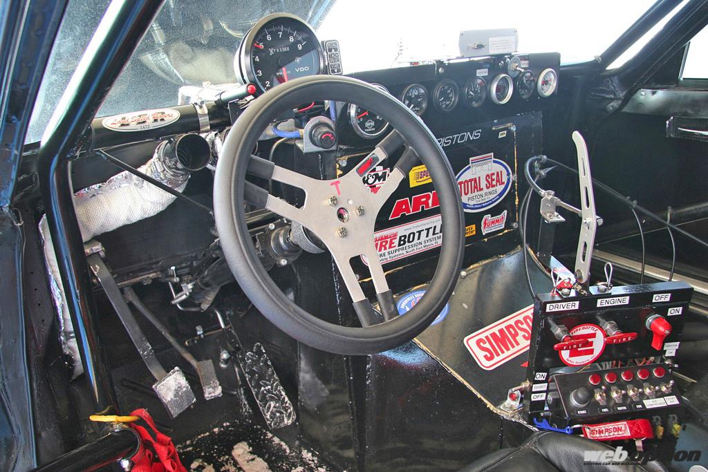 ボンネットを開けてもらうと、強引にバルクヘッドに食い込ませるように搭載されたビュイックの5326cc(325ci)直8を確認。インジェクション+ターボ化が図られる。吸排気がターンフロー式のため、タービンはスロットルボディの下に装着され、最大ブースト圧は1.0キロの設定だ。