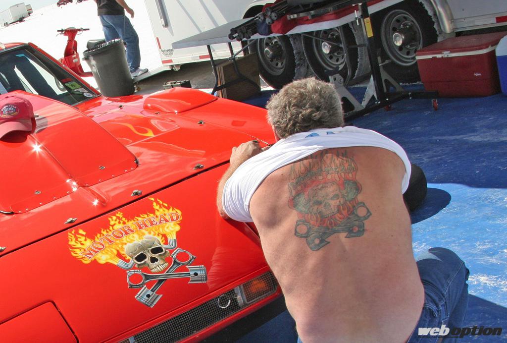 「ぜひ撮っていってくれよ。クルマと一心同体だぜ!」と、おもむろにTシャツをまくり上げるオーナー。背中には、ノーズにペイントされたイラストと同じタトゥーが! オーナーの気合もハンパじゃないのだ。
