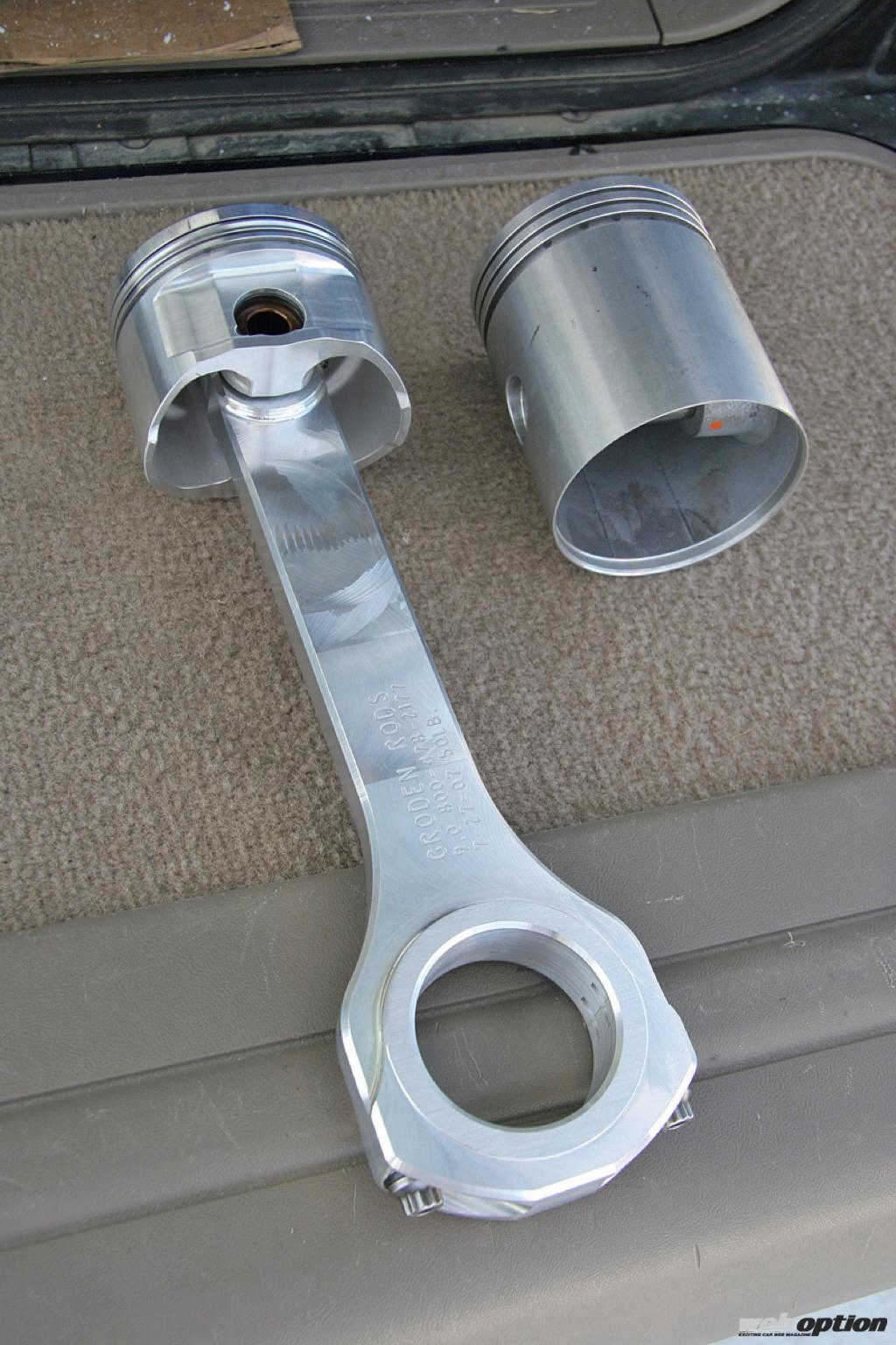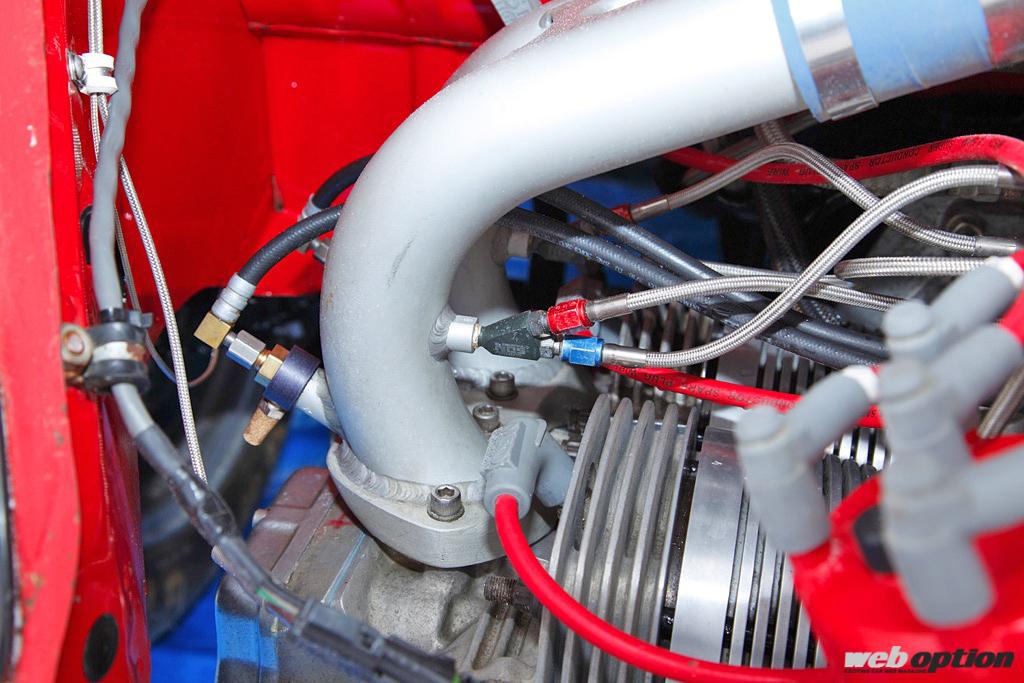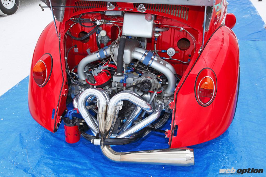 エンジンは、もともと搭載されていた1.5Lに代えて、VWバス(タイプII)用のクランクケースにワンオフシリンダーを組み合わせた2914cc仕様のフラット4に換装。吸排気系の取り回しが独特で、空冷(油冷)式のためシリンダーには冷却フィンが切られる。