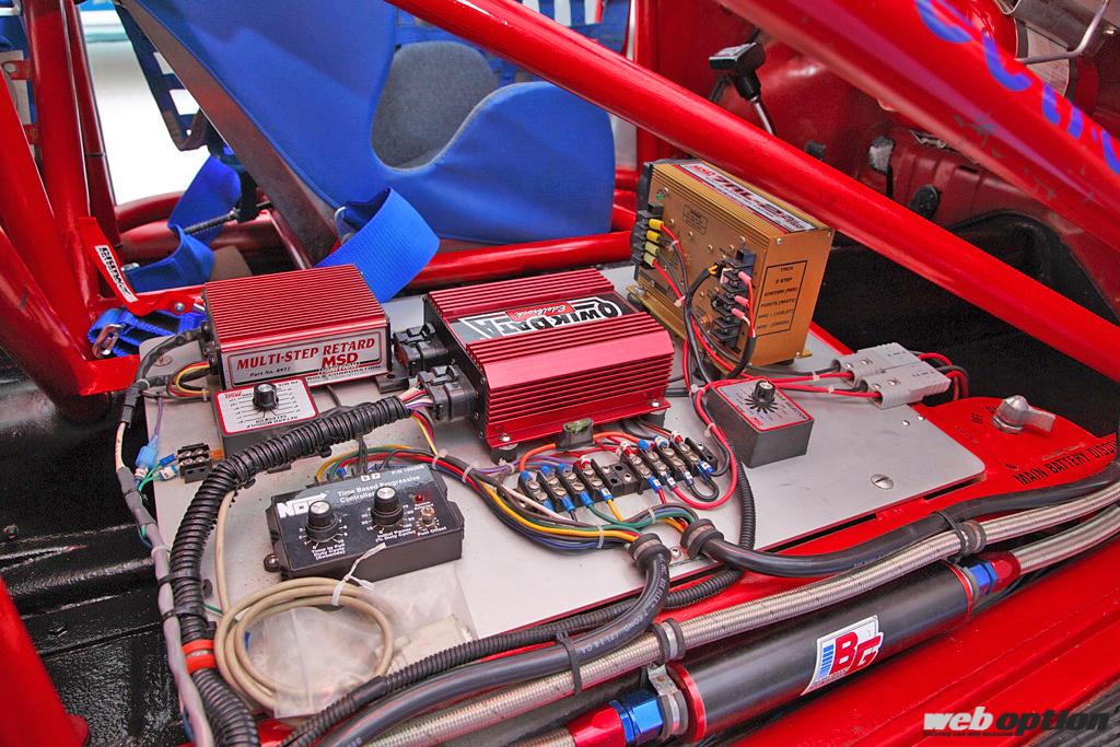 助手席の位置にセットされた制御系パーツ。メインECUはエーデルブロックのクイックデータで、点火系はMSDでコントロールされる。ピークパワーは400psだ。